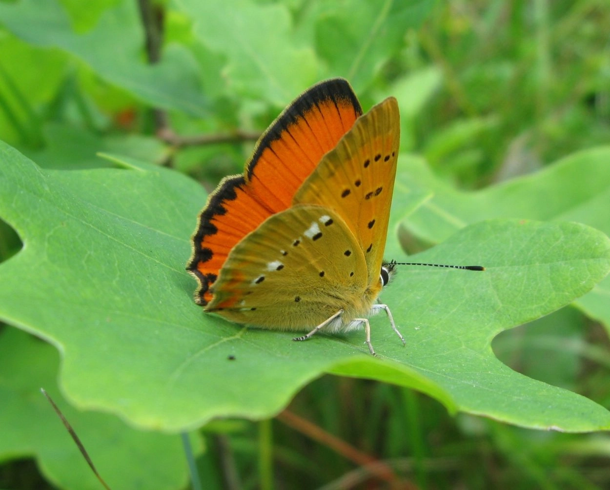 Voorvleugellengte: circa 16 mm. De bovenkant van de vleugels is bij het mannetje glanzend oranje. Bij het vrouwtje is de bovenkant van de vleugels oranje met een duidelijke, zwarte tekening. De onderkant van de achtervleugel is oranjegrijs met weinig zwarte stippen en enkele witte vlekjes. Deze witte vlekjes vormen een karakteristiek kenmerk dat bij geen enkele andere vuurvlinder voorkomt.