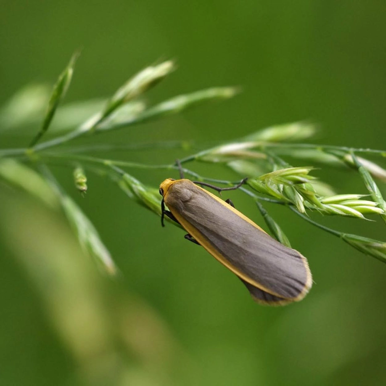 Voorvleugellengte: 15-17 mm. Het mannetje heeft een grijsachtige voor- en achtervleugel met een oranjegele franje en langs de voorrand een okergele streep die bij het wortelveld het duidelijkst is. Soms is het zoomveld donkerder dan de rest van de vleugel. Het vrouwtje is iets groter, heeft een donkere bruinachtig grijze, soms enigszins oranje getinte, voorvleugel met langs de voorrand een oranje streep en een grijze achtervleugel. Het borststuk is vaak geelachtig; er is geen duidelijke oranjegele kraag. Een belangrijk kenmerk zijn de donkere achterpoten. De kleur van de vleugels kan variëren, maar ze hebben altijd een enigszins zijdeachtige glans. De vlinder houdt in rust de vleugels plat boven het lichaam.