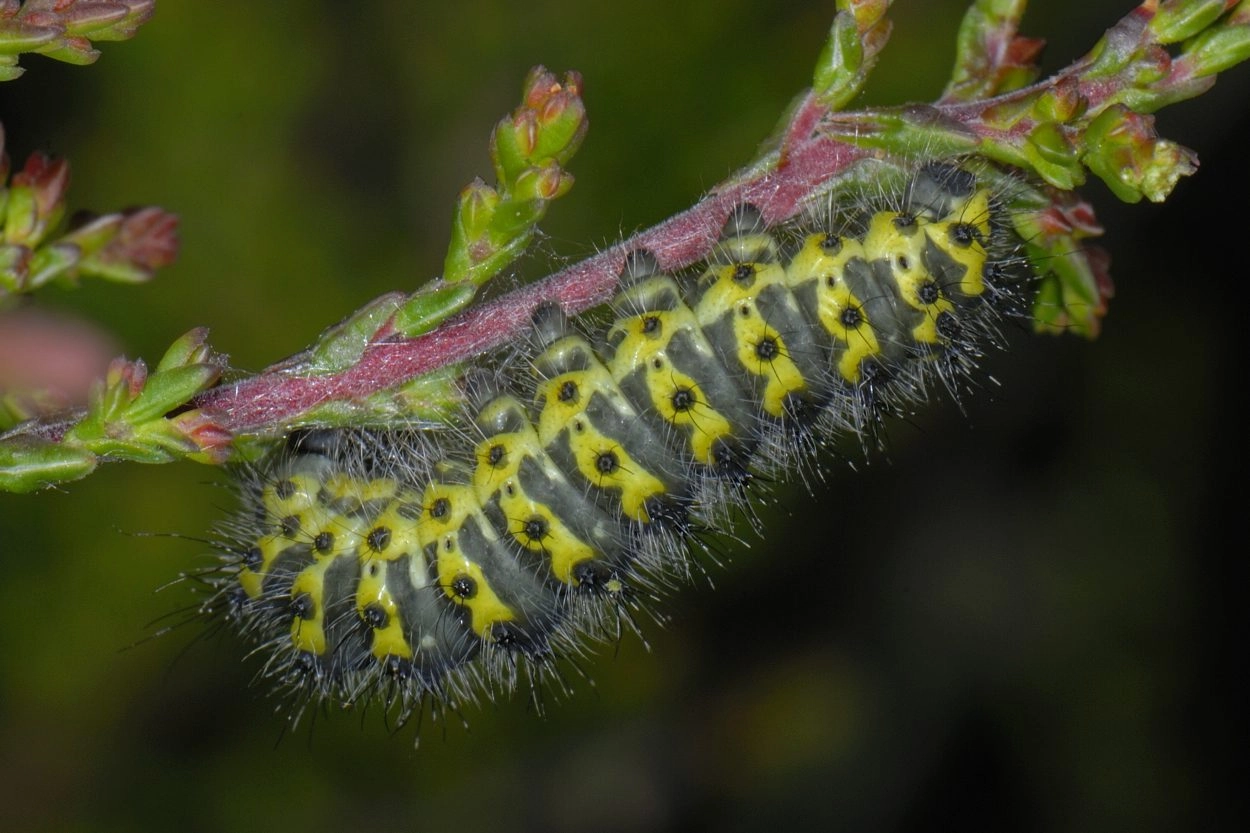 Tot 60 mm; lichaam donkergroen of geelachtig groen met transversale, zwarte banden, waarin gele of roze-purperen wratten met korte zwarte borstelharen staan geplaatst; de helderoranje spiracula zijn zwartgerand; kleine, groene kop. Het zwart van de banden is zeer variabel en is soms tot een aanrtal zwarte stippen gereduceerd, terwijl het in het andere geval dermate is uitgebreid, dat de banden elkaar raken. De jonge rupsjes zijn zwart met een geelachtige lengtestreep over de flanken.