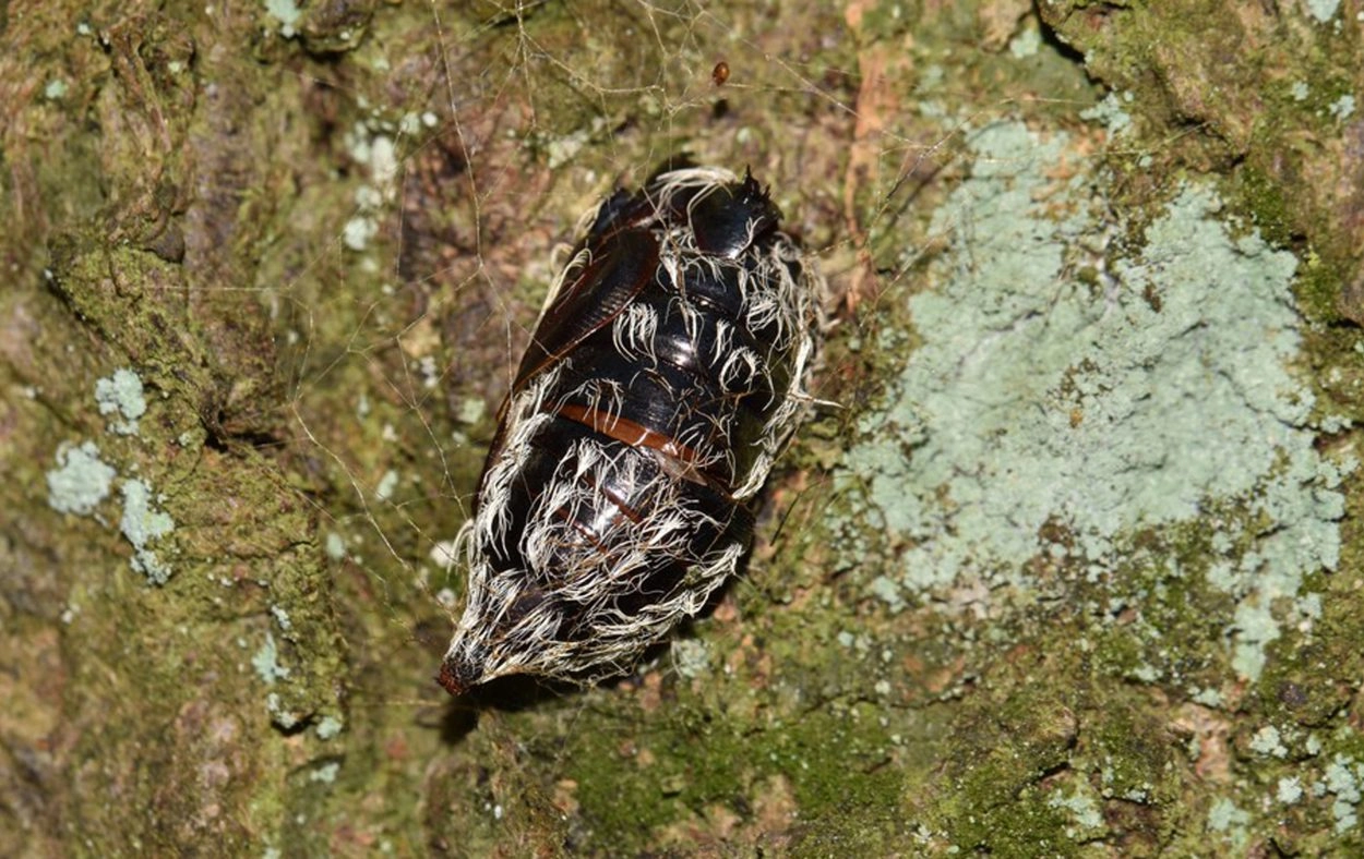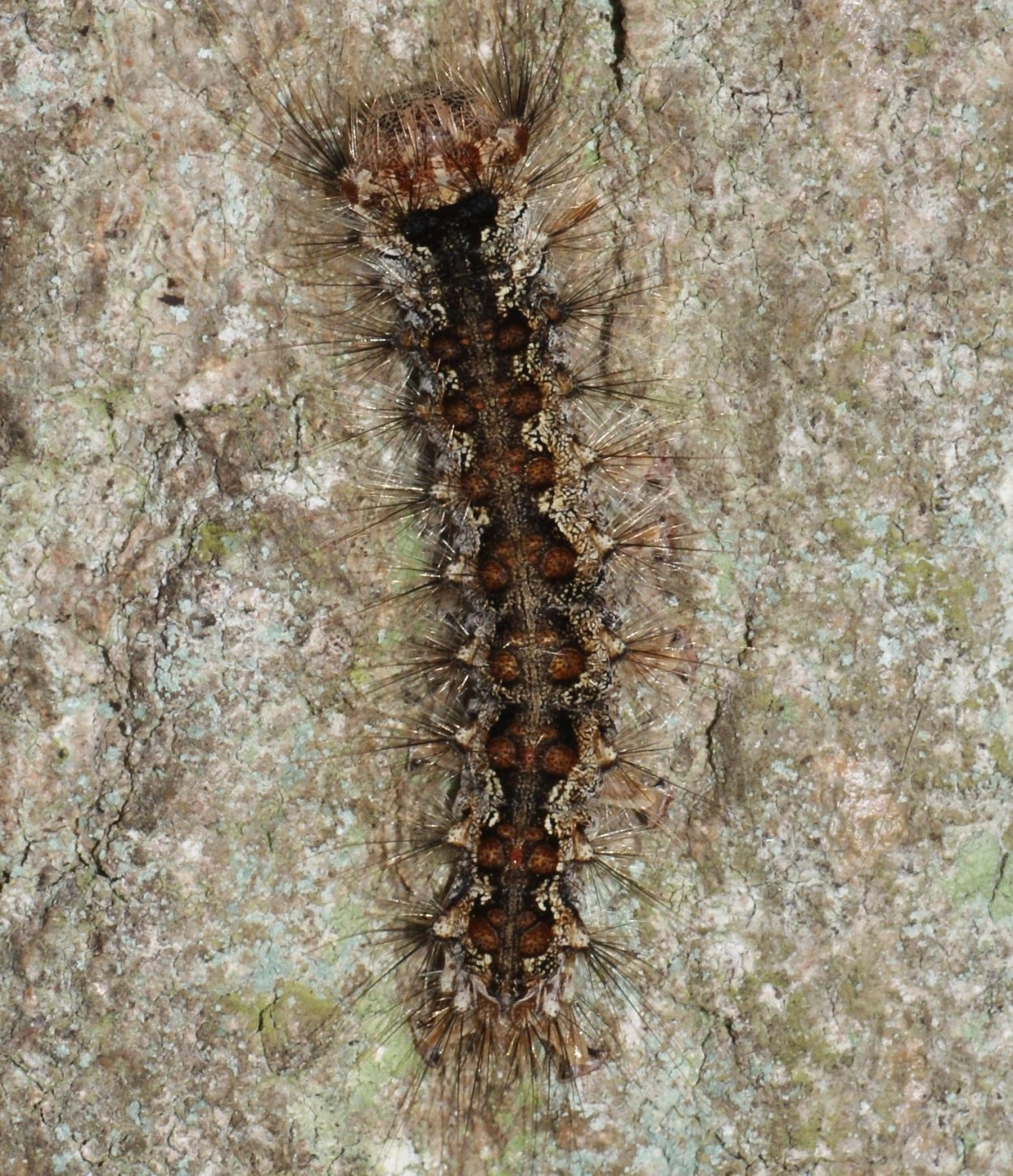 Tot 35 mm; lichaam licht okerachtig wit met over de rug een brede, zwartachtig grijze lengteband, die tussen de segmenten is ingesneden; korte, grijze haarborsteltjes staan op kleine wratjes ingeplant; de segmenten negen en tien hebben elk op het midden van de rug een kleine, verheven, rode vlek; kop licht okerkleurig, sterk zwart getekend.