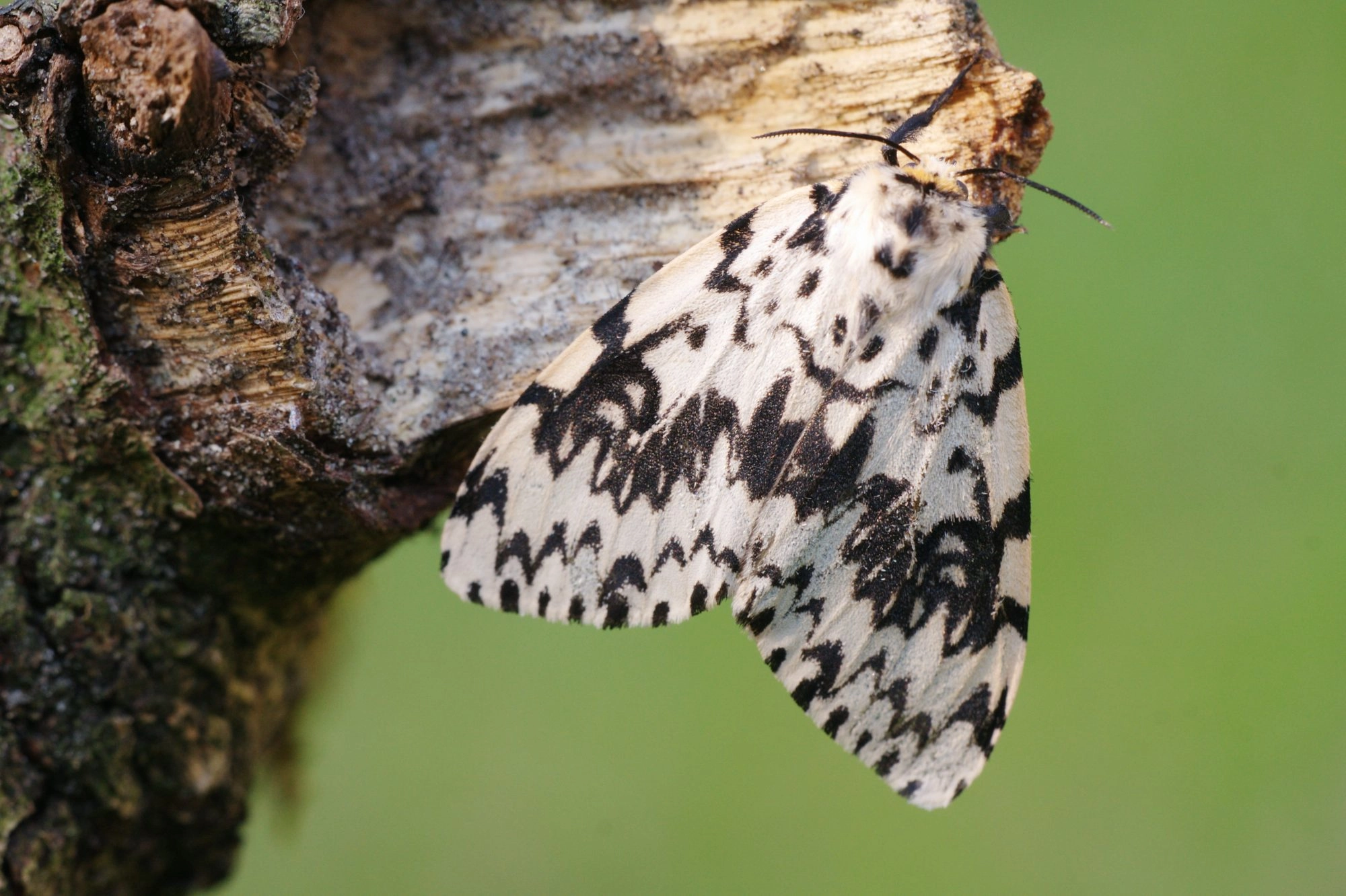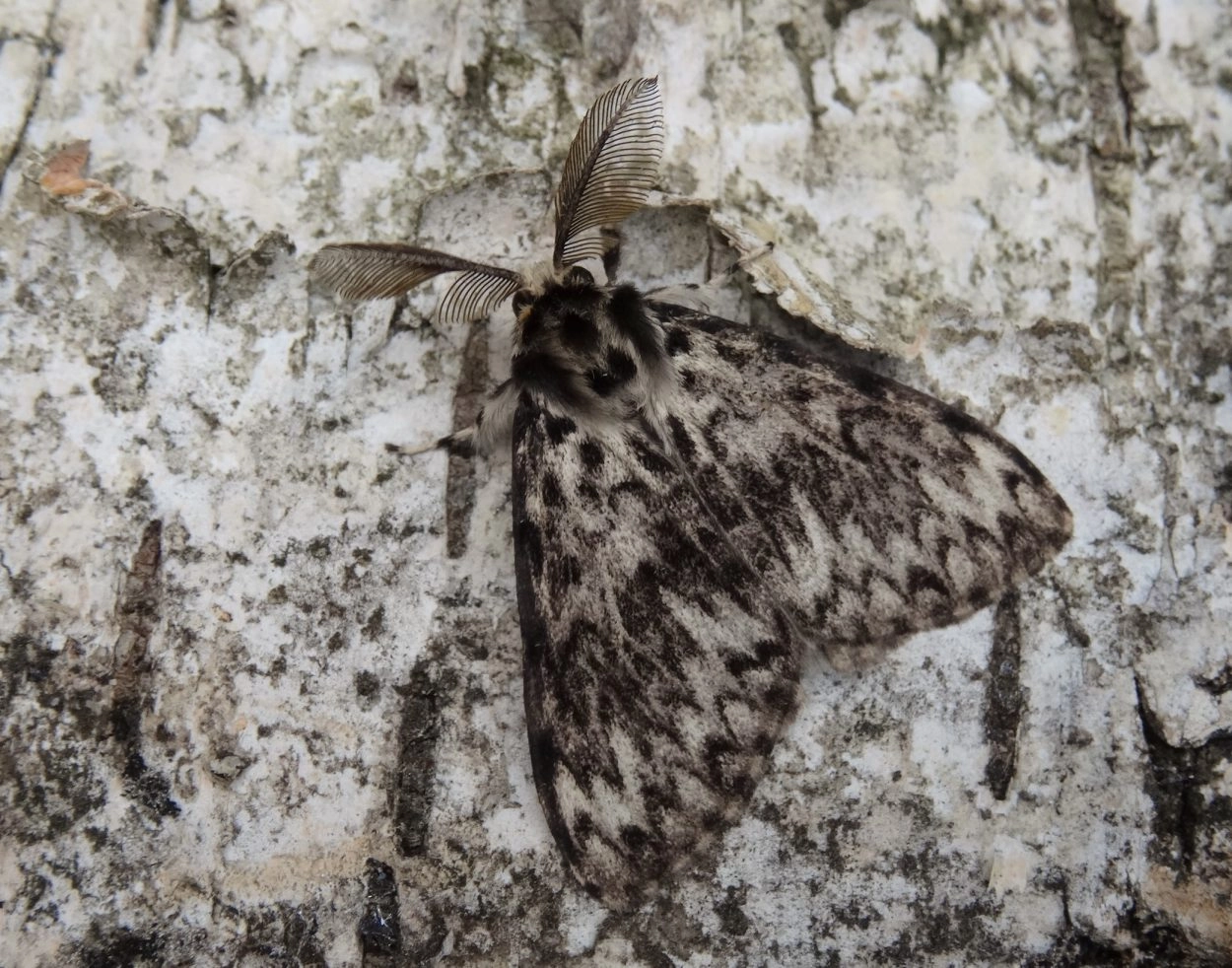Voorvleugellengte: ♂ 18-20 mm, ♀ 20-28 mm. Op de witte tot roomwitte voorvleugel bevindt zich een groot aantal zwarte, sterk getande dwarslijnen en vlekken. De binnenste zone van het middenveld is meestal leeg met uitzondering van een duidelijke middenstip. Meer naar buiten toe bevinden zich een omgekeerde V-vormige vlek en een paar dicht opeenstaande lijnen. Soms vloeien deze lijnen samen tot een donkere zone en soms is het gehele middenveld donker. Vaak komen vrijwel geheel zwarte of donkergrijze exemplaren voor. Het achterlijf heeft roze dwarsbanden, die vooral bij donkere vlinders soms heel vaag zijn. Het vrouwtje heeft een duidelijk gepunt achterlijf, waarmee ze de eitjes diep kan weg stoppen in een schorsspleet.