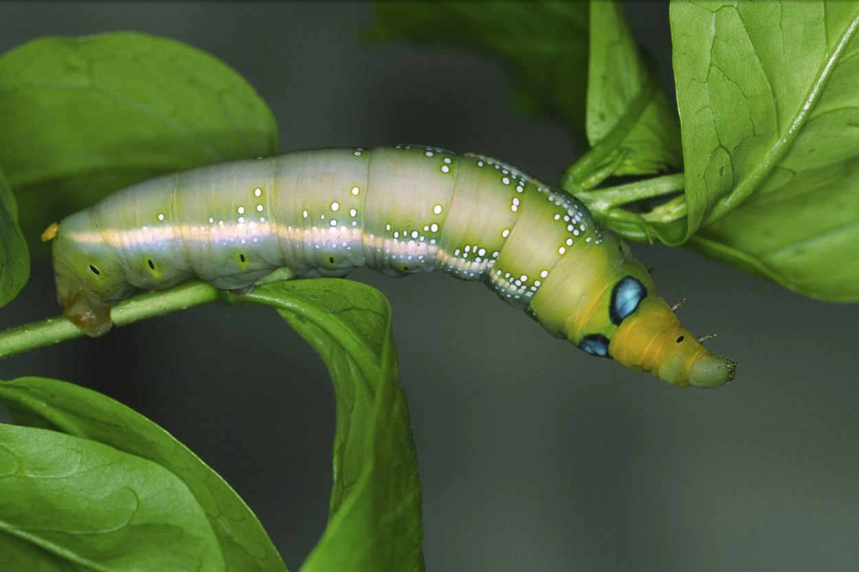 Tot 100 mm; kop klein, lichaam naar voren taps toelopend vanaf buiksegment 1. Rest van lichaam bijna cilindrisch. Heeft gewoonlijk een prominente lichtblauwe tot blauwe oogvlek op het derde segment en een bleke tot witte dorsolaterale lijn vanaf buiksegment 1 naar de hoorn. Hoorn stevig en naar beneden gebogen in laatste stadium. Lichaam bruin en glad in laatste stadium.
