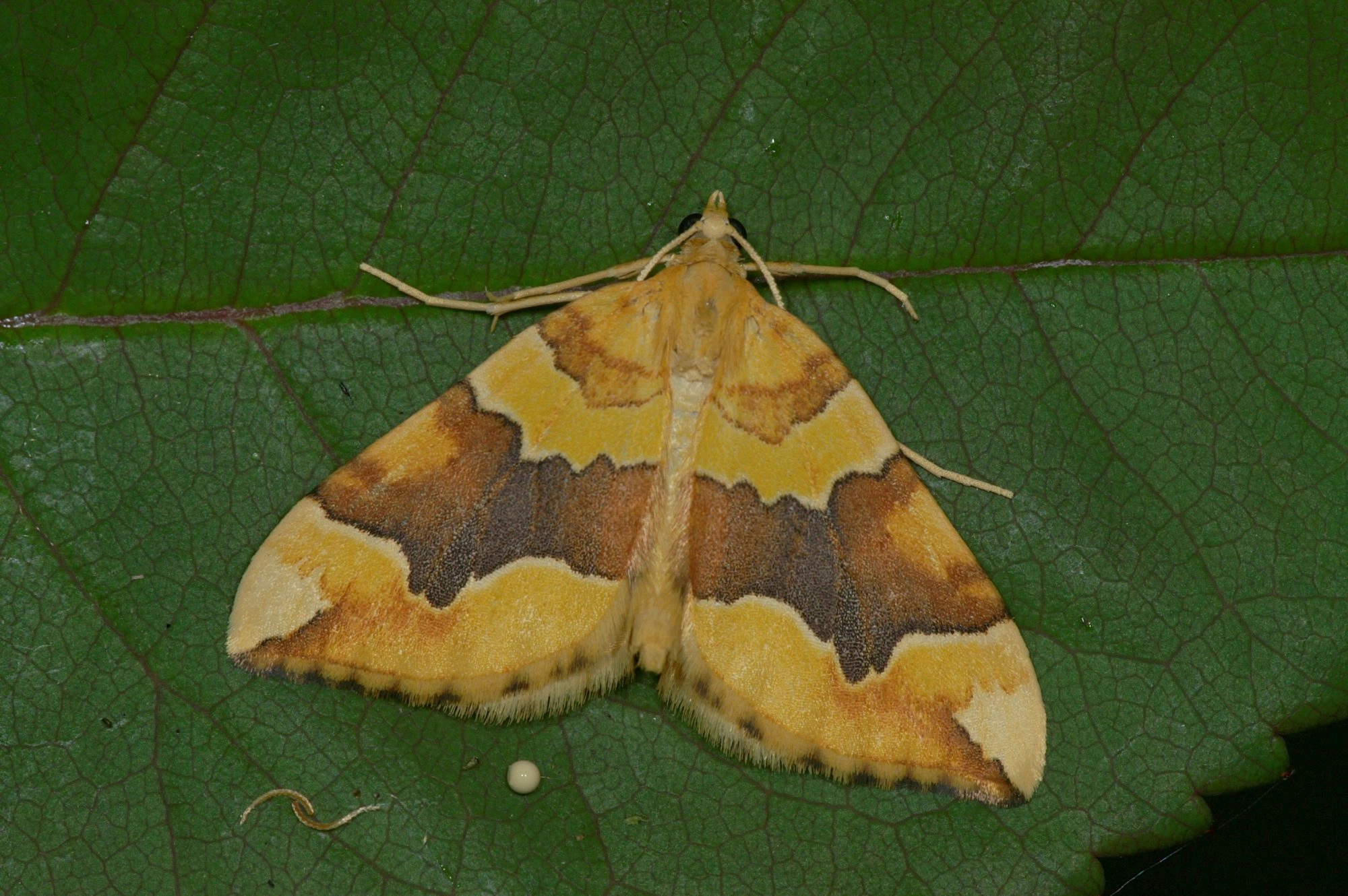 Voorvleugellengte: 12-14 mm. Goed herkenbaar door de helder oranjegele voorvleugel en de onregelmatig gevormde roodbruine middenband. Er is weinig variatie.