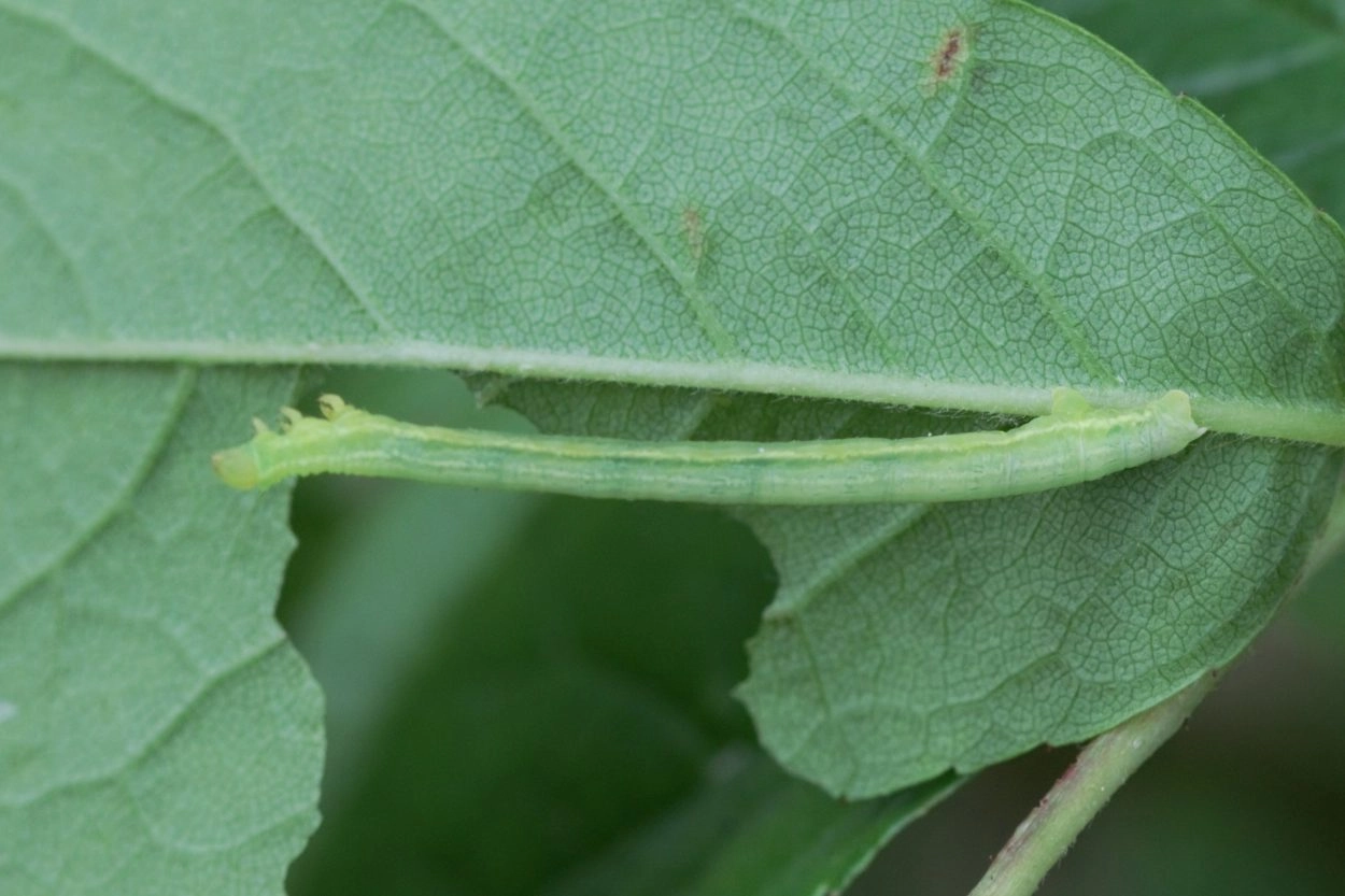 Tot 19 mm; blauwachtig groen of geelachtig groen met gele banden tussen de segmenten; over het midden van de rug een donkergroene lengtestreep met aan weerszijden daarvan een lichte witachtige lengtestreep; soms aan weerszijden daarvan een rij duidelijke roodachtig bruine vlekjes; kop groen, aan de bovenkant licht ingesneden.