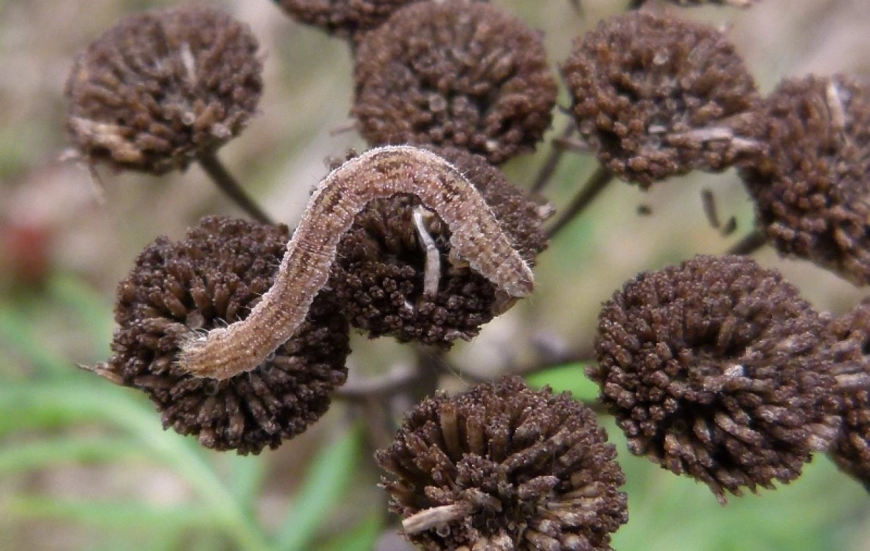 24-26 mm. Lijf grijsachtig bruin met donkerbruine blokjes op de rug en een witachtig grijze streep over het midden van de onderkant van de rups; ook bedekt met heel kleine bleke wratjes.