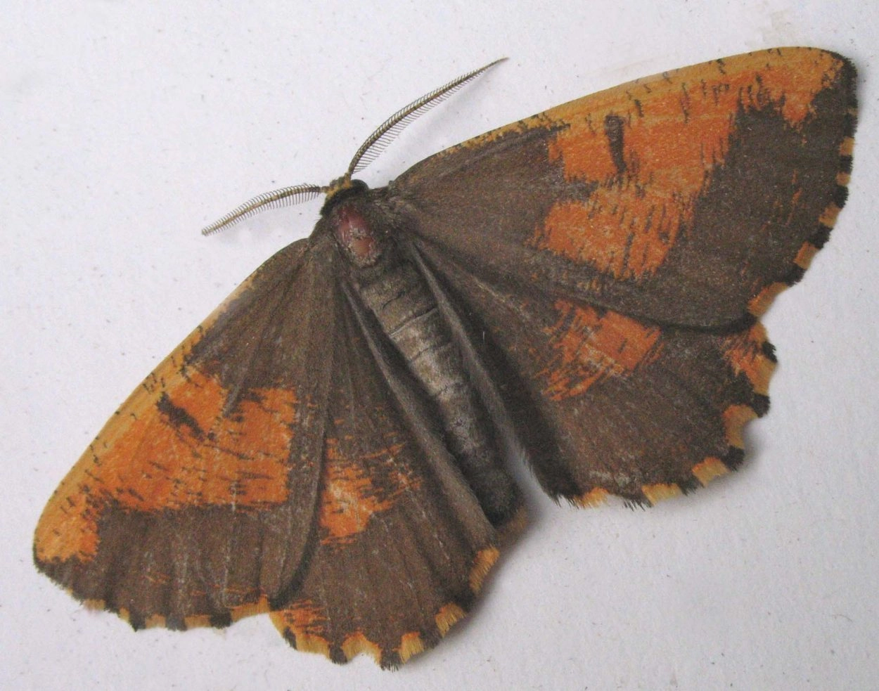 Voorvleugellengte: 20-30 mm. Het mannetje van deze opvallende spanner is meestal helemaal oranje gekleurd met een variabel patroon van bruine vlekjes die soms gebogen lijntjes vormen; midden op de voor- en achtervleugel bevindt zich gewoonlijk een bruin streepje of maanvormige vlekje. De soort is echter zeer variabel; het mannetje heeft vaak een bruine band op de voorvleugel en soms een volledig bruine achtervleugel. De franje is geblokt, behalve bij extreem donkerbruine exemplaren. Het vrouwtje lijkt sterk op het mannetje maar is lichtgeel en heeft ongeveerde antennen.