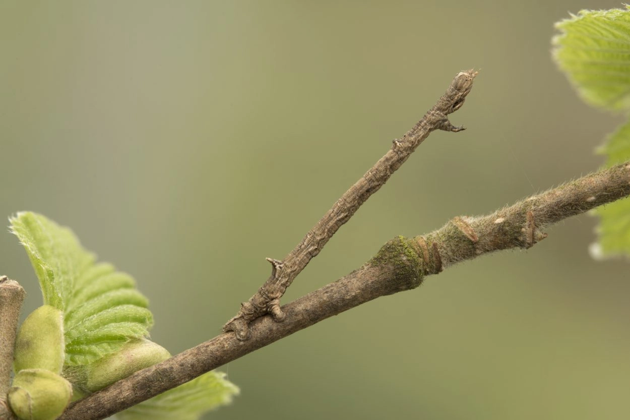 Tot 50 mm; lichaam varieert in kleur van bleek geelachtig bruin tot grijsachtig bruin of roodachtig bruin, soms met een aantal zwartachtige strepen en vlekken op rug en flanken; op de rugzijde van segment vijf een paar kleine bulten; op de rugzijde van segment negen een opvallend paar lange, gepunte uitwassen; kop bruin.