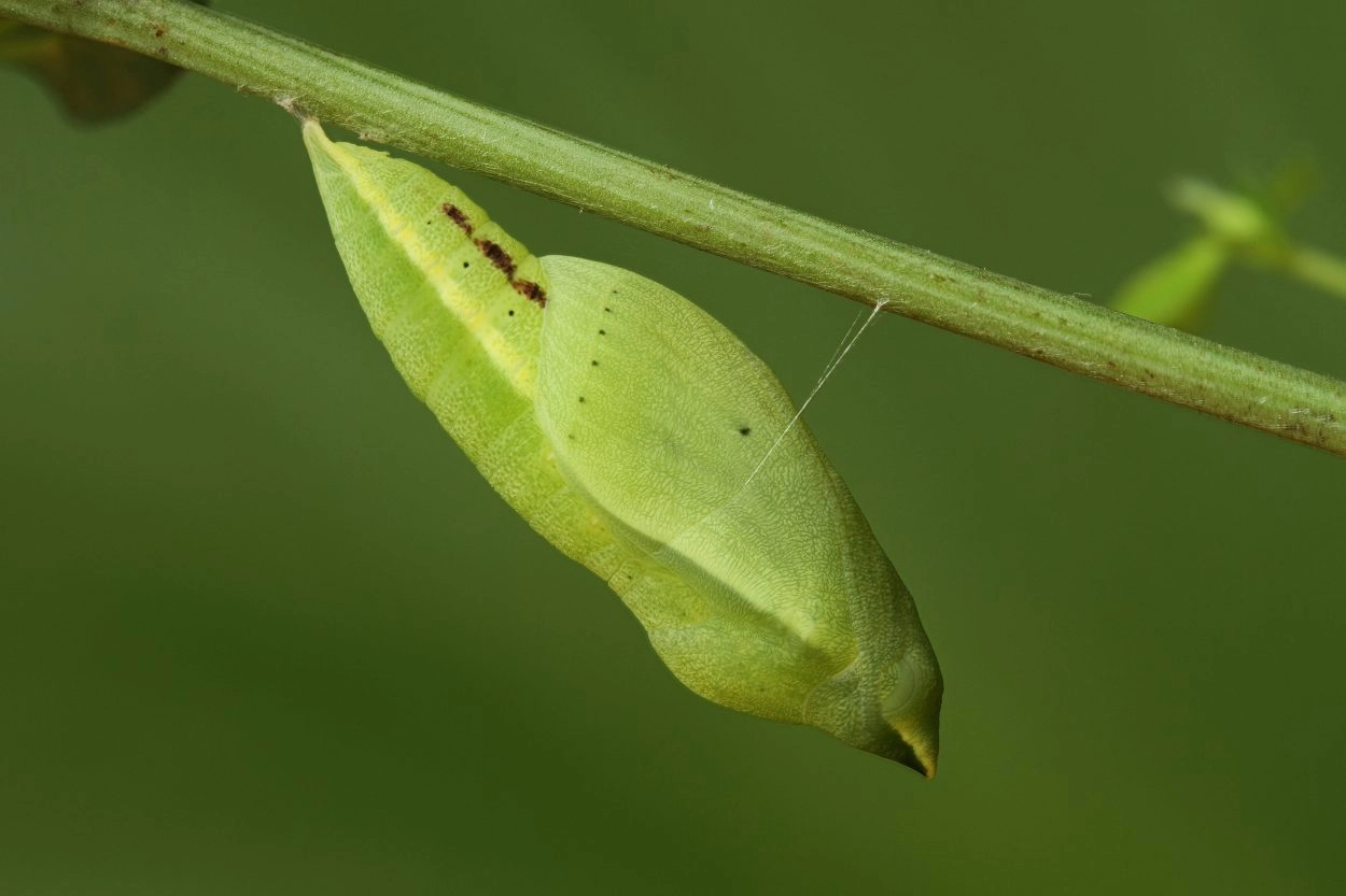 Tot 33 mm; lichaam groen fijn zwart gespikkeld; over de spiraculae loopt een geelachtig witte streep met daarin - aan weerszijden van elk spiraculum - rode en oranje veegjes; onder deze streep een aantal kleine zwarte vlekjes, één op elk segment. Heeft door de fijne lichaamsbeharing een witachtige kleur.