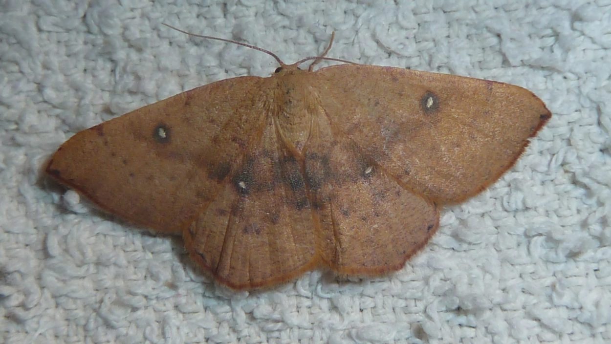 Voorvleugellengte: 12-15 mm. Een goed kenmerk om deze soort te onderscheiden van verwante soorten is de tamelijk effen grondkleur met een slechts geringe fijne bespikkeling. De vleugels zijn oranjeachtig bruin met een roze tint en elke vleugel heeft een donker omrand oogje. De voorvleugelpunt heeft een fijn sikkelpuntje. Daarin bevindt zich een miniem klein, maar opvallend zwart schuin streepje; dit detail is kenmerkend is voor deze oogspanner. De vleugeltekening is bijzonder variabel: zowel de gestippelde dwarslijnen, de purperachtig roodbruine middenschaduw als de oogjes variëren sterk in intensiteit en grootte.