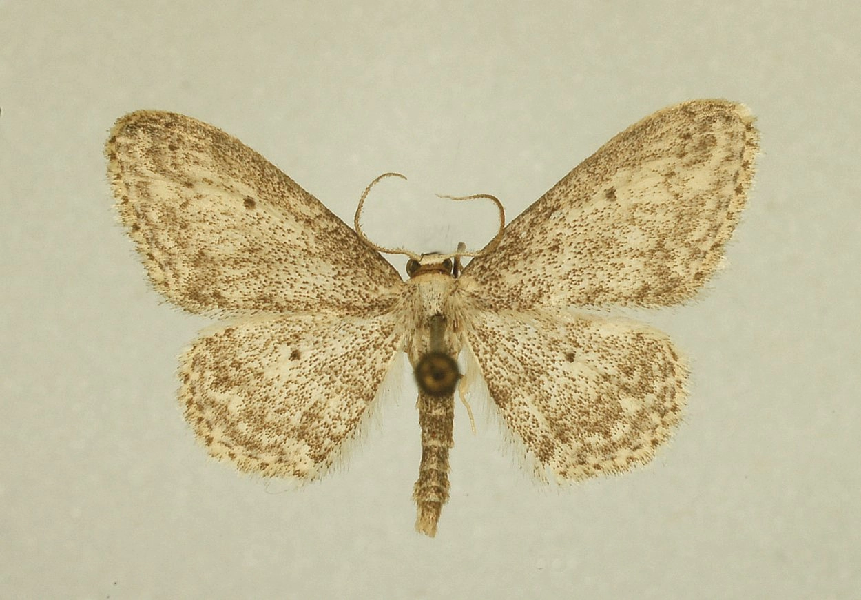 Voorvleugellengte: 9-11 mm. De voor- en achtervleugel zijn in meer of mindere mate donker bespikkeld. De vleugelzoom is meestal iets donkerder dan de rest van de vleugel. Op alle vleugels is een duidelijke middenstip aanwezig. De binnenste en de buitenste dwarslijn zijn dun maar altijd tenminste zichtbaar aan de stipjes op de aderen. De middelste dwarslijn is vaag en loopt op de voorvleugel dicht langs de middenstip, vaak er enigszins naar toe buigend. Opvallend is dat dit laatste ook geldt voor de buitenste dwarslijn ter hoogte van de stip. De franjelijn langs de achterrand bestaat uit afwisselend donkere stipjes en boogjes.