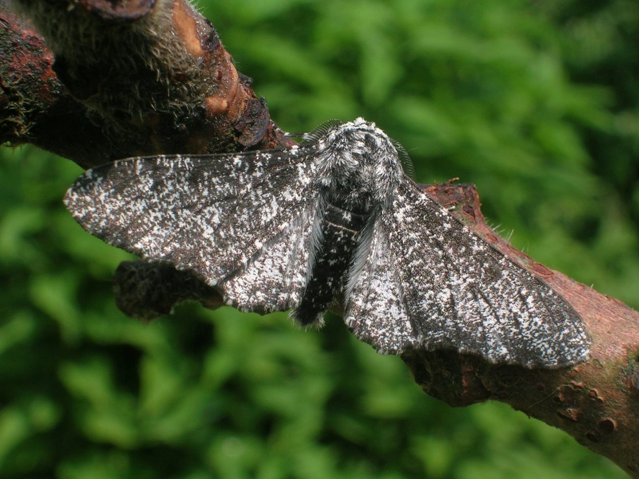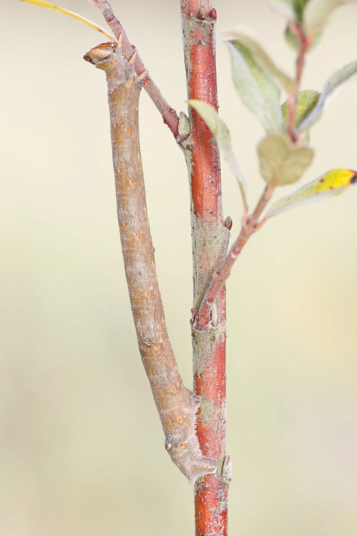 Vroege spanner (Biston strataria).N.B.: let bij deze twee soorten ook vooral op de tijd van het jaar waarin de rupsen voorkomen.