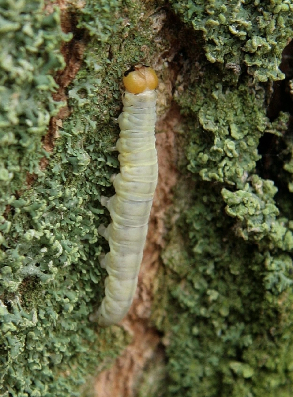 Tot 37 mm; lichaam bleekgeel met groenachtig grijze zweem; over de spiracula een heldergele lengtestreep; nekschild op segment een glimmend lichtgrijs; segment een, twee, drie en elf met zwarte vlekjes aan weerszijden; kop geelachtig bruin met zwarte tekening op de voorzijde.