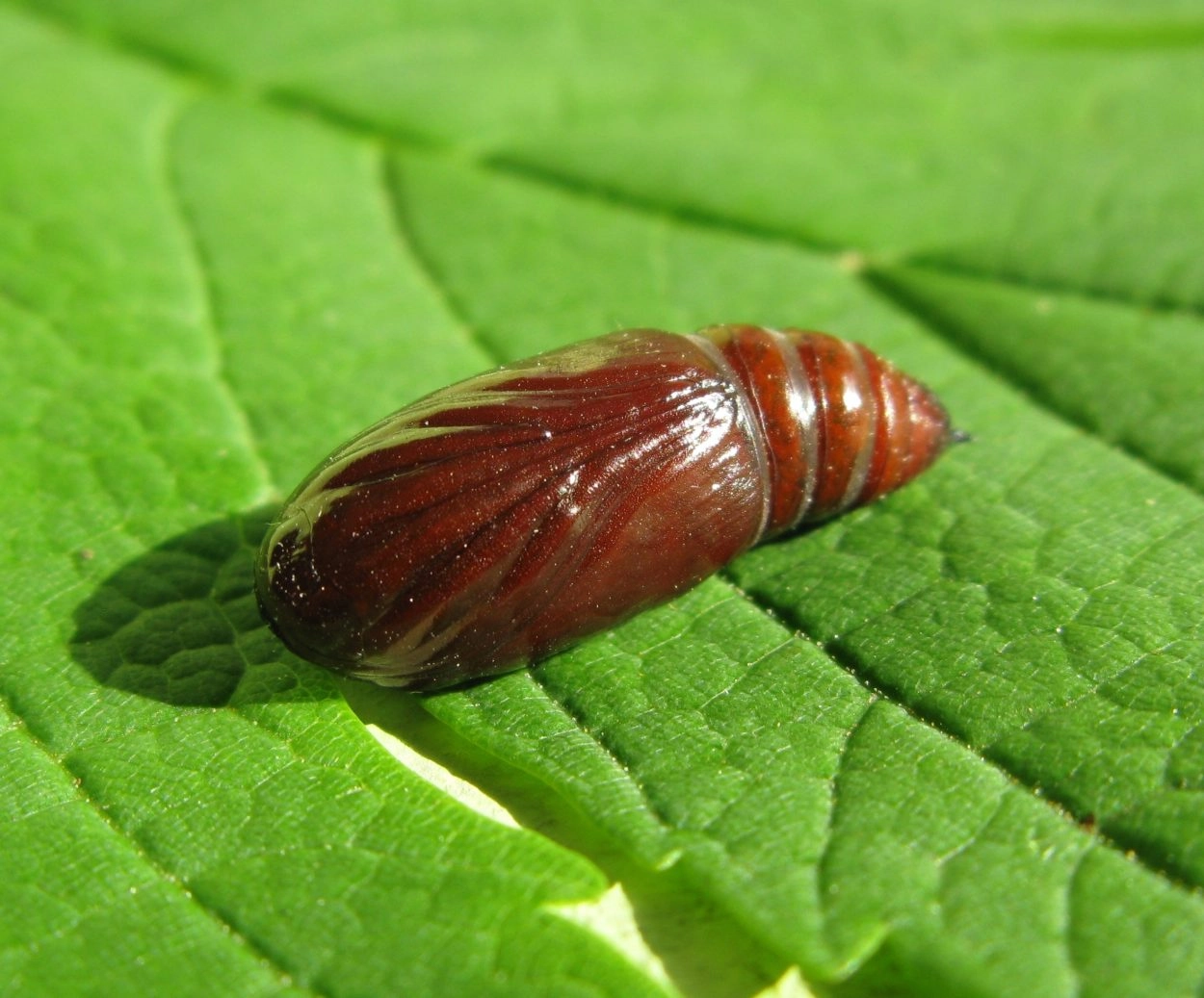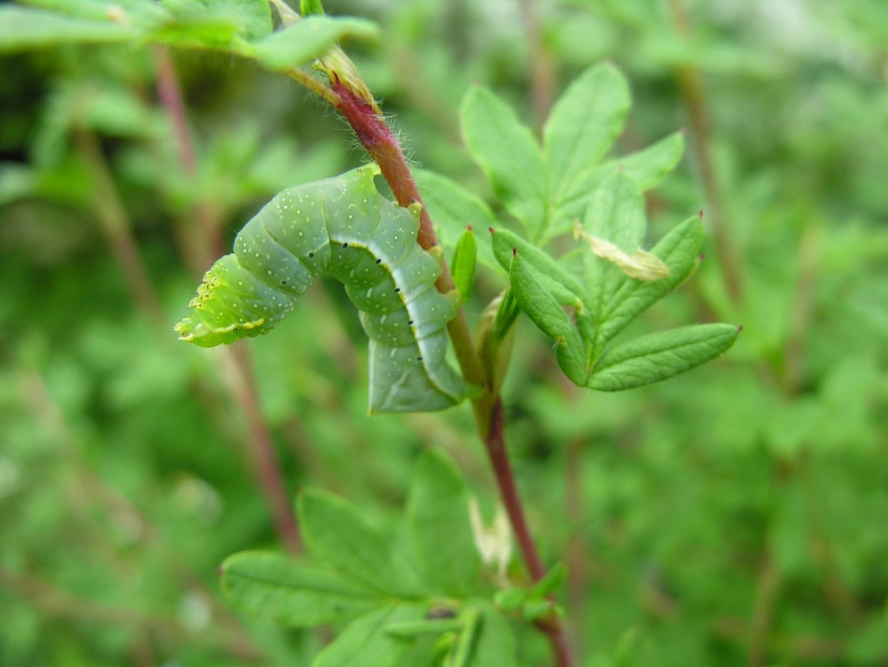 Tot 42 mm; lichaam plomp, bleek groenachtig blauw of helder groen; segment elf met een opvallende driehoekige bult met gele punt; over de rug een witte middenstreep met aan weerszijden een patroon van witte lijntjes en stippen; over de spiracula een witte lengtestreep; op de eerste twee segmenten wordt de gehele witte tekening geelachtig; kop lichtgroen met aan weerszijden een witte streep.