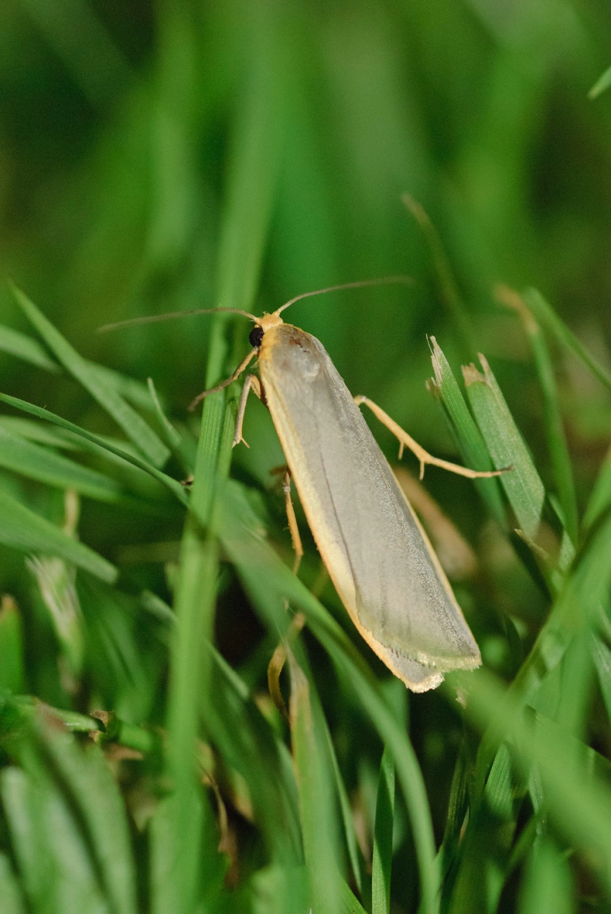Voorvleugellengte: 14-17 mm. Langs de voorrand van de loodgrijze voorvleugel ligt een duidelijke contrasterende gele streep, die in de richting van de vleugelpunt steeds smaller wordt of zelfs verdwijnt voordat deze bereikt is. De achterpoten zijn grotendeels geel. De achtervleugel is lichtgeel en heeft soms een grijze veeg langs de voorrand. De vlinder houdt in rust de vleugels plat boven het lichaam.
