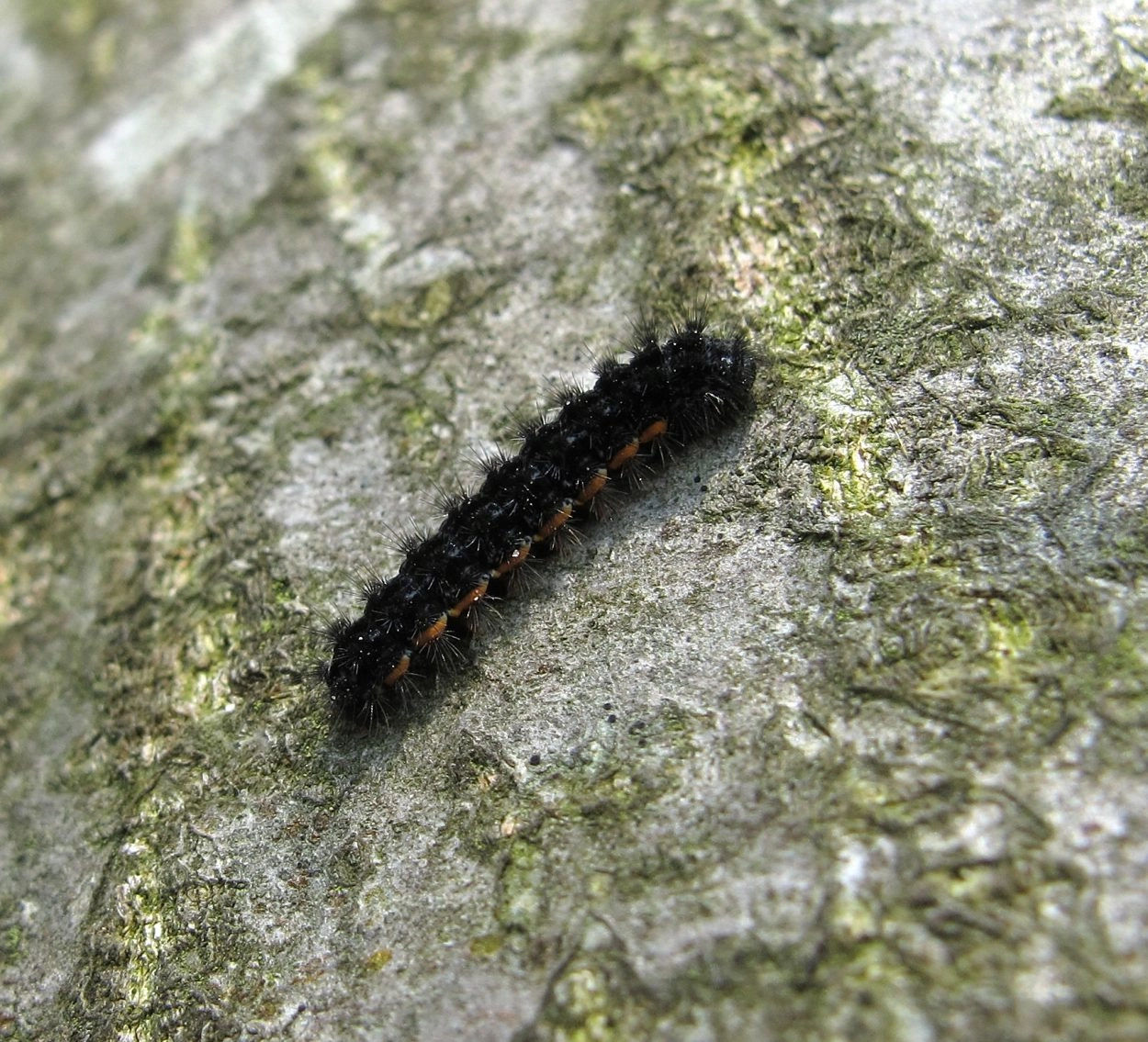 Tot 22 mm; lichaam fluweelzwart aan de bovenzijde en bruinachtig grijs aan de onderzijde, overdekt met korte zwarte en grijze haarborsteltjes, die op kleine, verheven wratjes staan ingeplant; over de flanken een oranje lengtestreep, die op de eerste drie segmenten ontbreekt; kop glimmend zwart.
