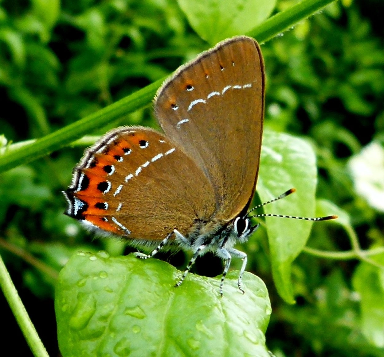 Voorvleugellengte: circa 15 mm. De grondkleur van de bovenkant van de vleugels is donkerbruin. Het iets grotere vrouwtje is lichter van kleur en heeft op de bovenkant van de voorvleugel een oranje veeg die bij het mannetje ontbreekt. Langs de achterrand van de onderkant van de achtervleugel bevindt zich een heldere, oranje band die aan de binnenzijde met opvallende zwarte vlekken is afgezet; de oranje vlekken hebben geen duidelijke halvemaanvorm. De witte lijn lijkt soms op een W; deze W is echter niet duidelijk en heeft gebogen zijkanten. De achtervleugel heeft een klein staartje; bij het staartje bevinden zich een of twee blauwe vlekjes.