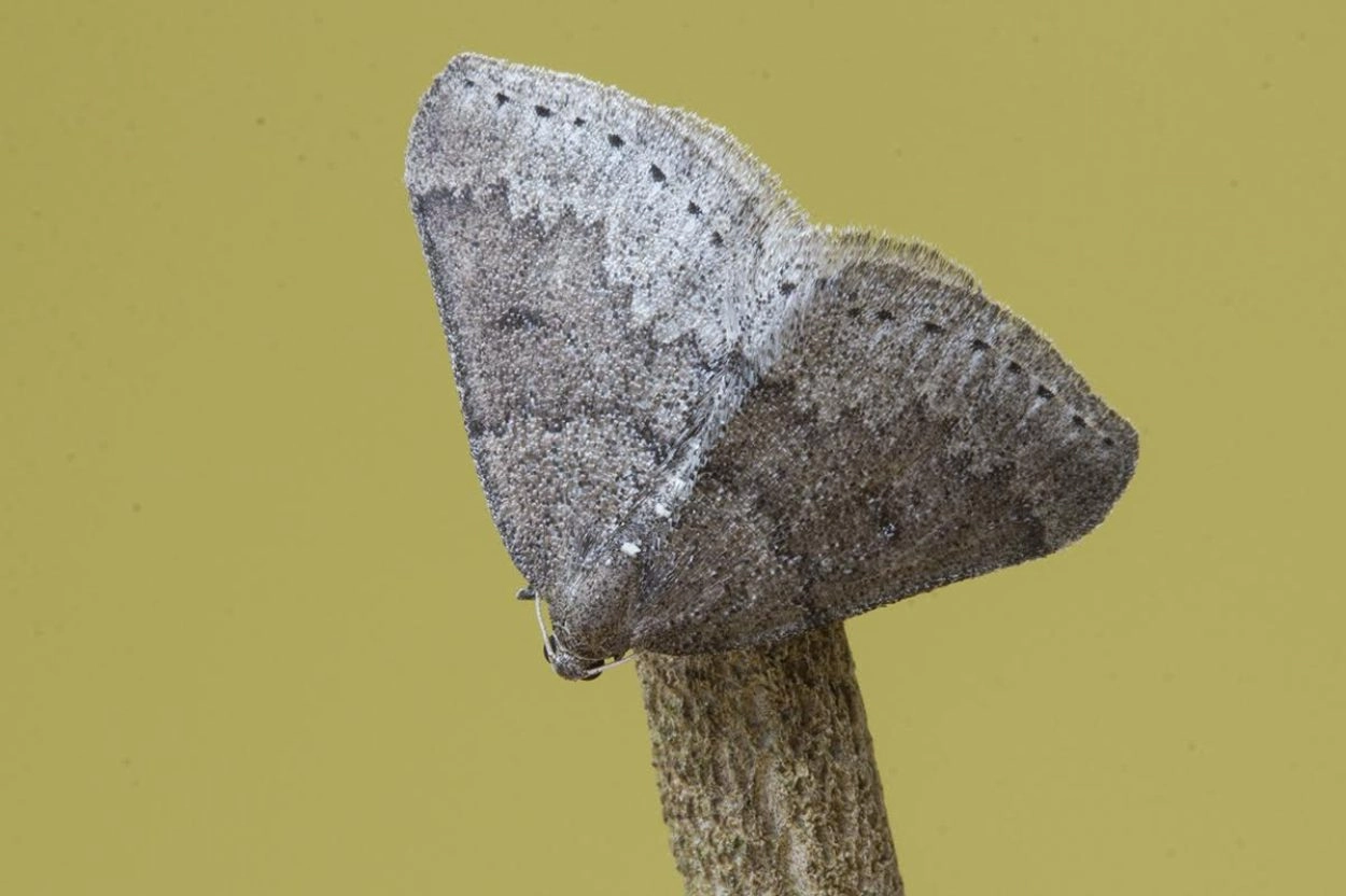Voorvleugellengte: 13-14 mm. Een bruine spanner met een puntige voorvleugel en opvallende witte stippen op het achterlijf. Over de voorvleugel loopt een donkerbruine middenband met donkere gekartelde randen. De donkere middenvlek op de achtervleugel is soms slechts vaag aanwezig.