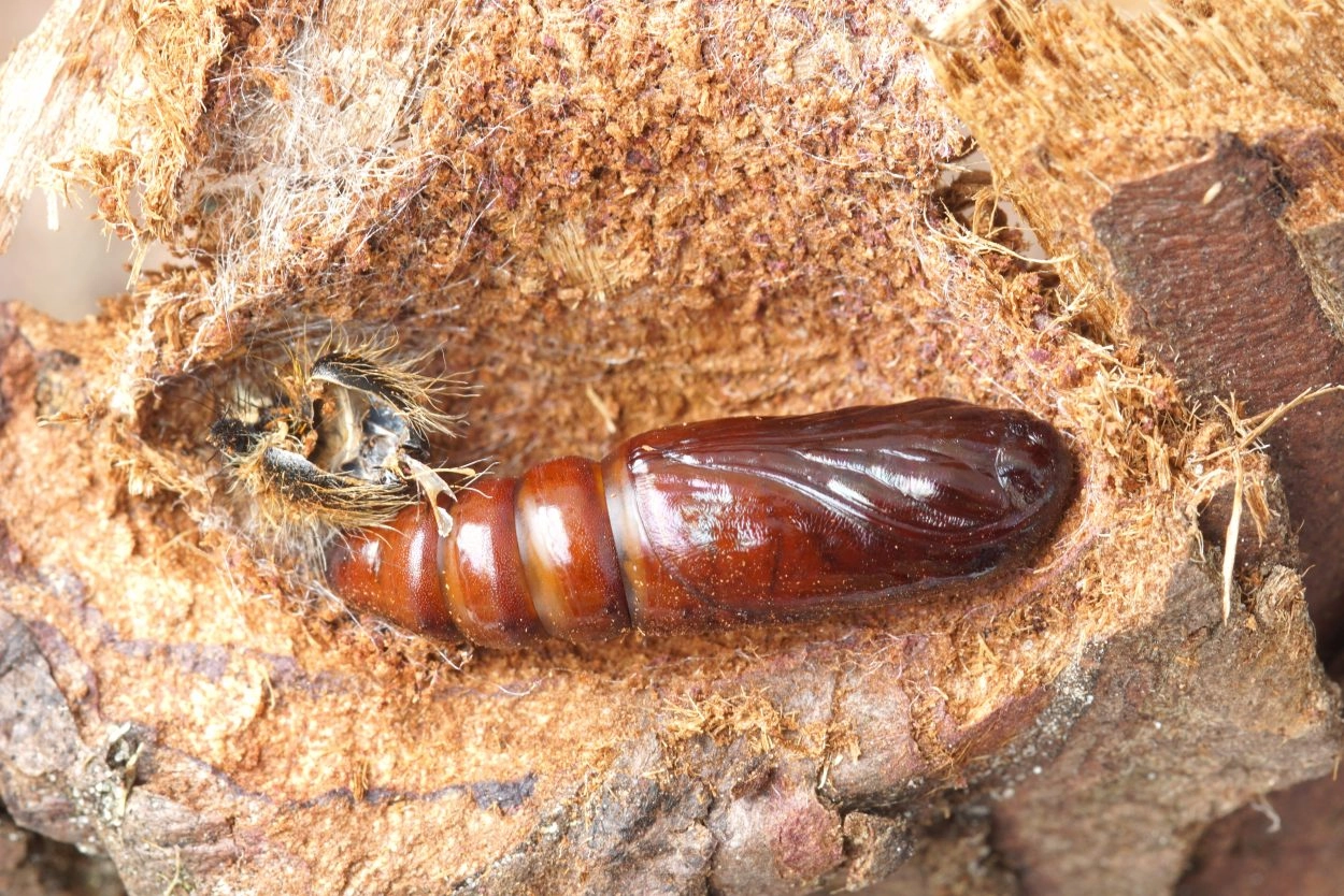 Rups: juni-oktober. De soort overwintert als pop in een losse grijze cocon achter schors, in een schorsspleet of in dood hout.