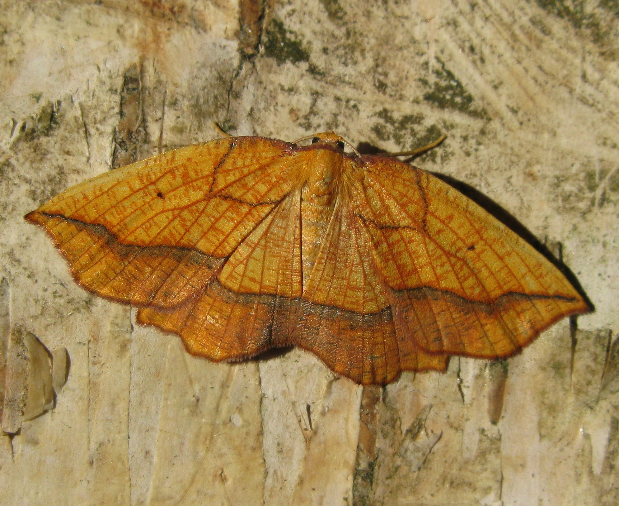 Zoomspanner (Epione vespertaria).N.B.: vergelijk behalve de uiterlijke kenmerken ook de tijd van het jaar waarin de rupsen voorkomen, het habitat en de waardplant(en).