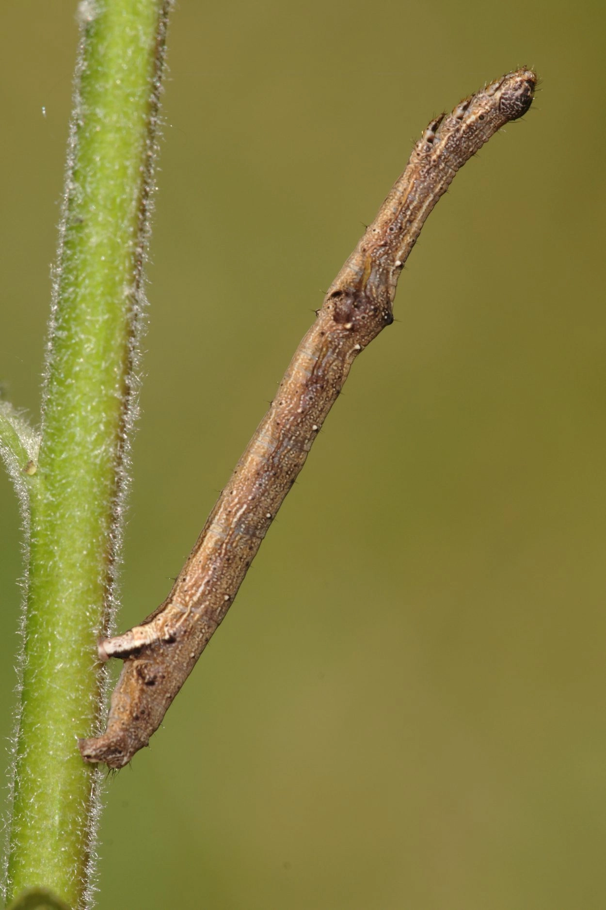 Tot 28 mm; lichaam bruin of grijs met op de rug een aantal okerkleurige, driehoekige vlekjes, die door witte stippen worden geflankeerd; onder de spiracula een brede, bleek okerkleurige lengtestreep; op segment vijf een kleine dubbelgepunte knobbel op de rugzijde; kop grijsachtig bruin aan de bovenzijde, okerkleurig aan de onderzijde.