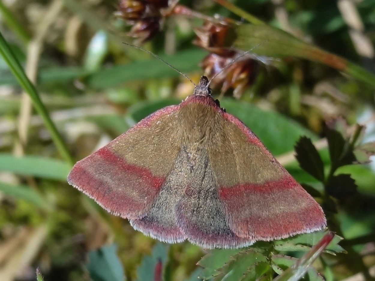 Voorvleugellengte: 9-11 mm. Deze kleine spinneruil houdt in rust de vleugels soms uitgespreid en doet dan enigszins aan een spanner denken. De binnenste helft van de voorvleugel is lichtbruin tot okergeel met een rozerode streep langs de voorrand. Op de buitenste helft van de voorvleugel bevinden zich twee opvallende rozerode banden, met daar tussenin soms een smallere derde rozerode band. De achtervleugel heeft dezelfde lichtbruine tot okergele kleur, is grijs met zwart bestoven en heeft een donkerroze met zwart geschubde middenband en een donkerroze zoom. De franje van zowel de voor- als de achtervleugel is wit. Het borststuk is bruin; de kop en de antennen zijn grijs.