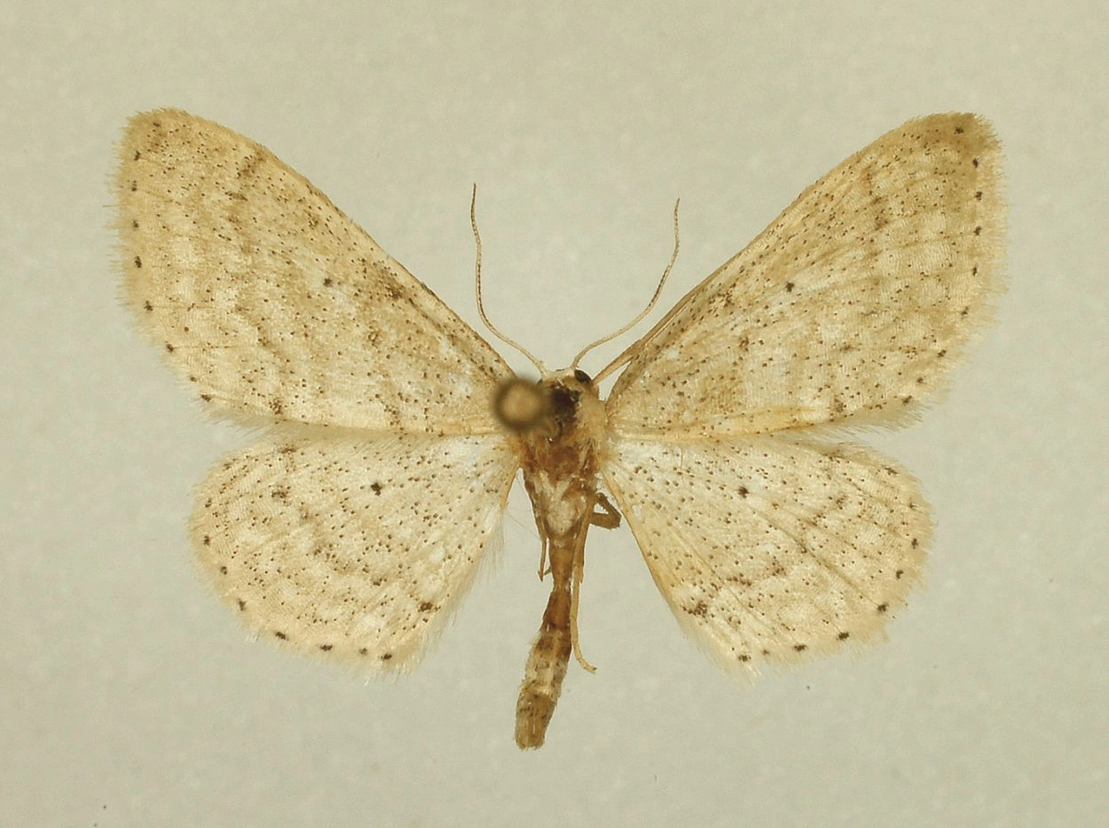 Voorvleugellengte: 10-12 mm. De bruinachtig witte vleugels zijn fijn bespikkeld met zwartachtige schubjes. De gewoonlijk nogal onduidelijke gegolfde bruinachtige dwarslijnen variëren in intensiteit. Zowel op de voor- als de achtervleugel bevindt zich een duidelijke zwarte middenstip en een rij goed zichtbare, uit zwarte stipjes bestaande franjelijn langs de achterrand. Soms komt een kleinere en bruinere variant voor.