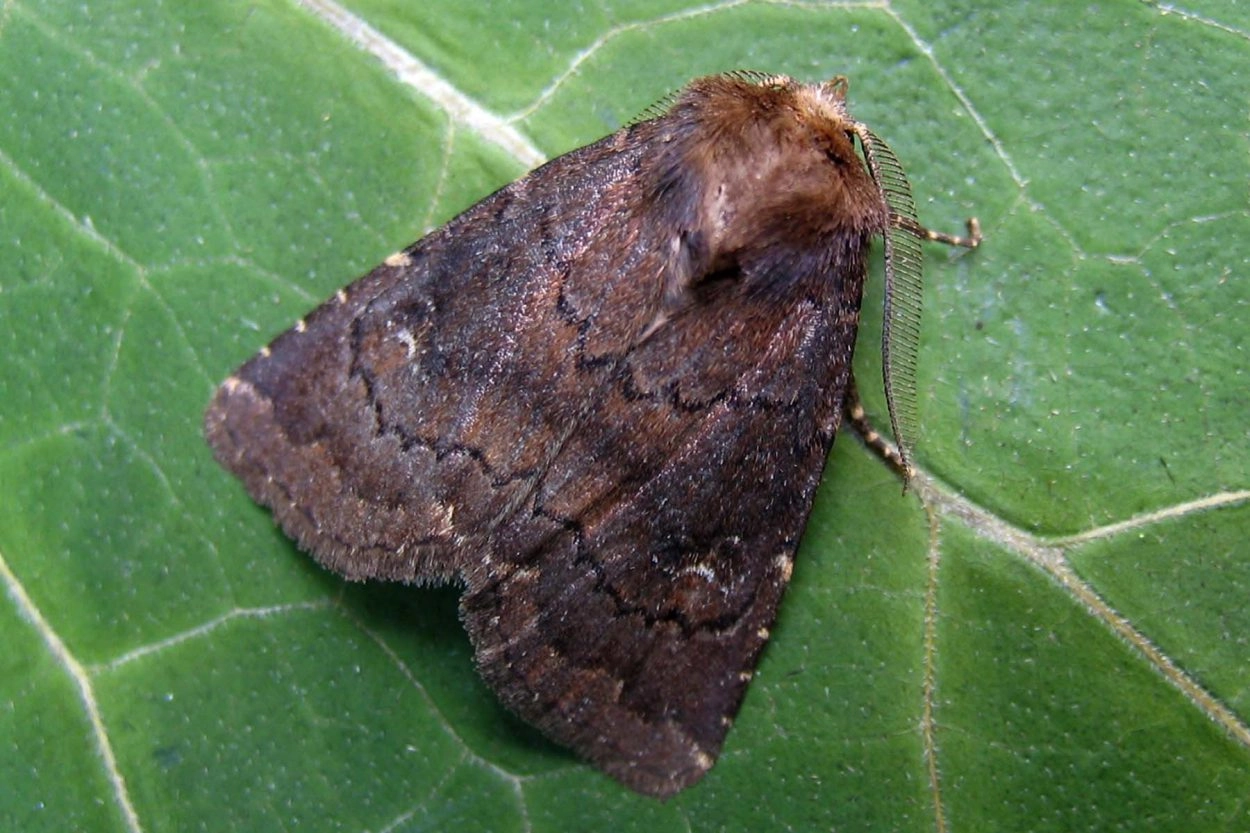 Voorvleugellengte: 14-16 mm. Deze uil is ondanks de vaalbruine kleur en de vaak onduidelijke tekening meestal niet moeilijk te herkennen. Het mannetje heeft sterk geveerde antennen en een tamelijk brede bruine of donkerbruine voorvleugel. De achterrand van de voorvleugel vormt zowel met de voorrand als met de binnenrand een bijna rechte hoek. Langs de voorrand bevinden zich vijf of zes witachtige vlekjes, waarvan de grootste twee zich meestal aan het uiteinde van de donkere centrale dwarslijnen bevinden. Vaak valt een donkere middenschaduw tussen de niervlekken op. Het vrouwtje is kleiner, heeft een smallere voorvleugel en de achterrand gaat veel geleidelijker over in de binnenrand; bovendien heeft het vrouwtje ongeveerde antennen en een minder sterke tekening.