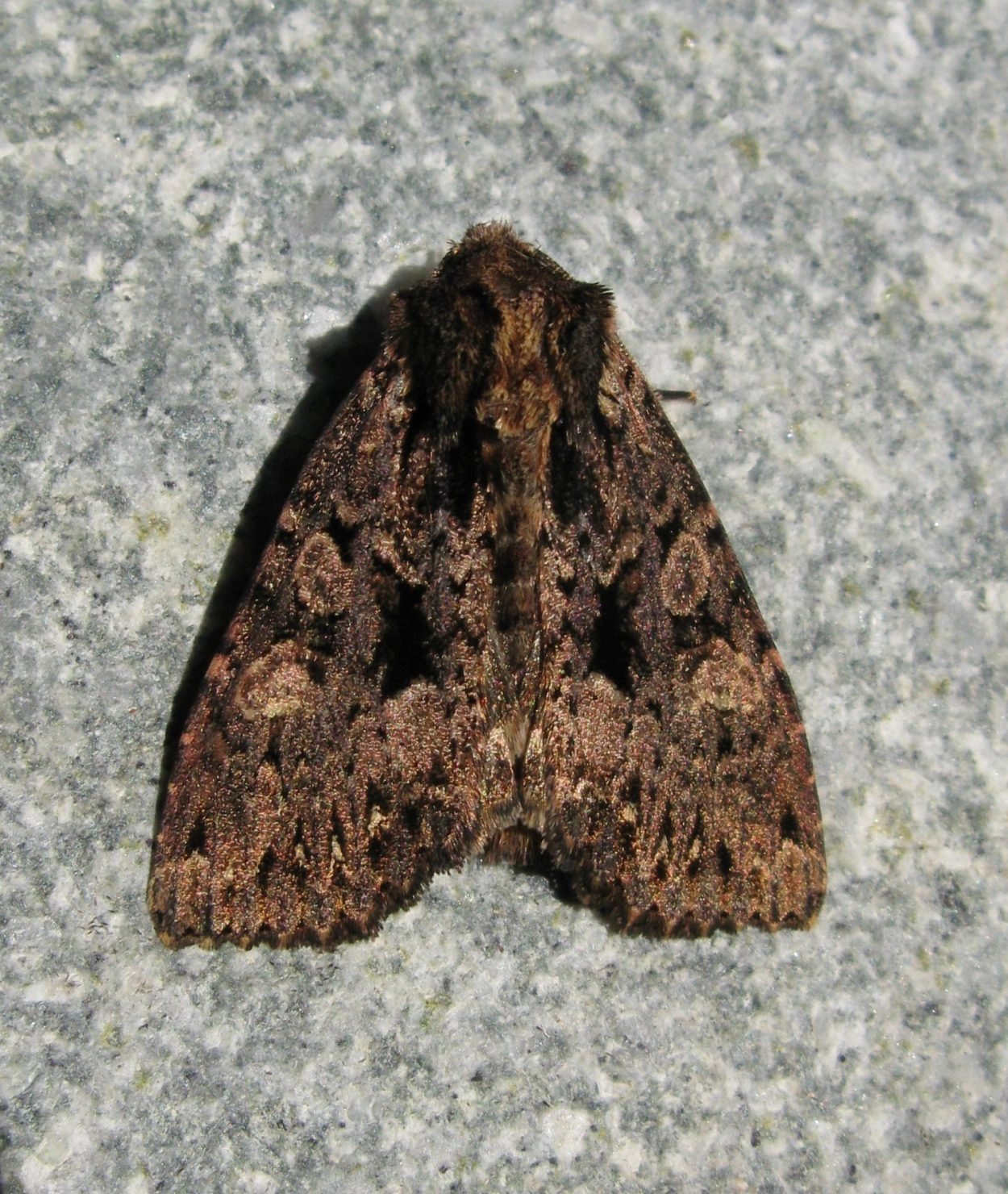 Voorvleugellengte: 19-23 mm. Deze uil vertoont enige gelijkenis met sommige Apamea-soorten; de voorvleugel is tamelijk breed en heeft vaak een groenige glans. Een belangrijk kenmerk wordt gevormd door de grote roodachtig bruine vlekken in het zoomveld; deze vlekken vormen samen doorgaans een brede band die contrasteert met de grijsachtig bruine grondkleur van de vleugel. Ook in het wortel- en middenveld bevinden zich roodachtig bruine vlekken, waarvan vooral de ringvlek en de niervlek opvallend zijn. Net als bij enkele verwante soorten ligt in het middenveld, evenwijdig aan de binnenrand, een korte dikke zwarte streep. Langs de zoom van de achtervleugel ligt een donkere halvemaanvormige vlek. Aan de bovenzijde van het borststuk bevindt zich een roodachtige kuif.