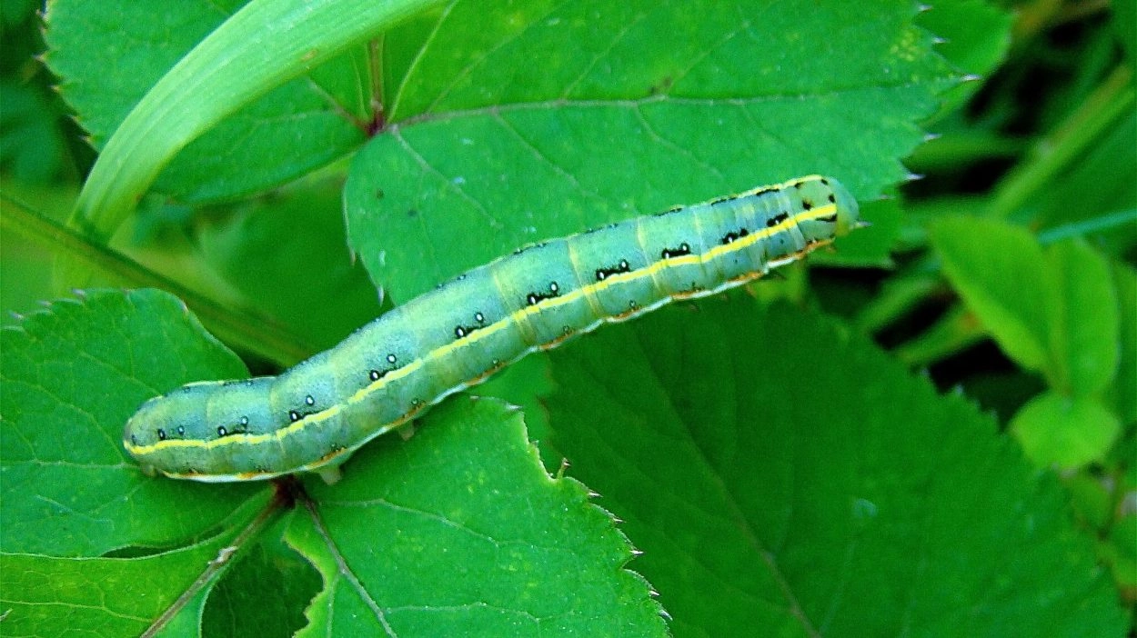Tot 65 mm; groot en plomp; lichaam helder groen; over de rug twee gele lengtestrepen met daartussen een rij witgekernde, zwarte vlekken die echter soms ontbreken; onder de spiracula een witte lengtestreep met langs de bovenrand een gebroken, helder rode lengtestreep; kop bruinachtig groen tot geelachtig groen.