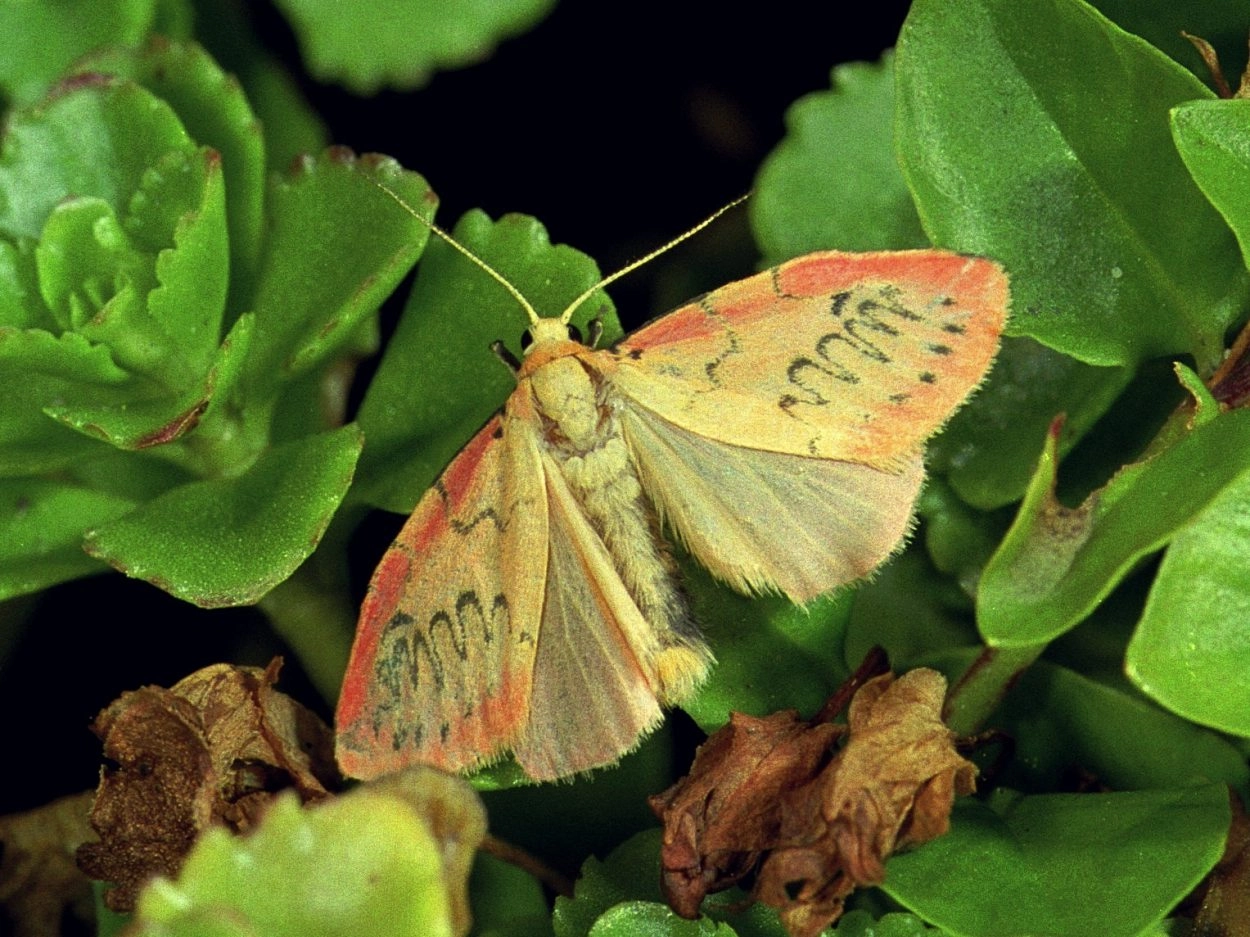 Voorvleugellengte: 12-15 mm. Een goed herkenbare soort. Heeft een afgeronde voorvleugel met een fijne diep getande dwarslijn iets voorbij het midden en een rij kleine donkere vlekjes of stippen bij de achterrand. De voorvleugel is gewoonlijk rozerood langs de voor- en achterrand en lichter van kleur in het midden; heel zelden is de vleugel egaal geel.