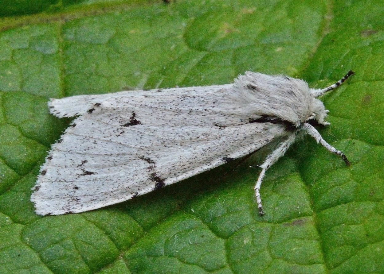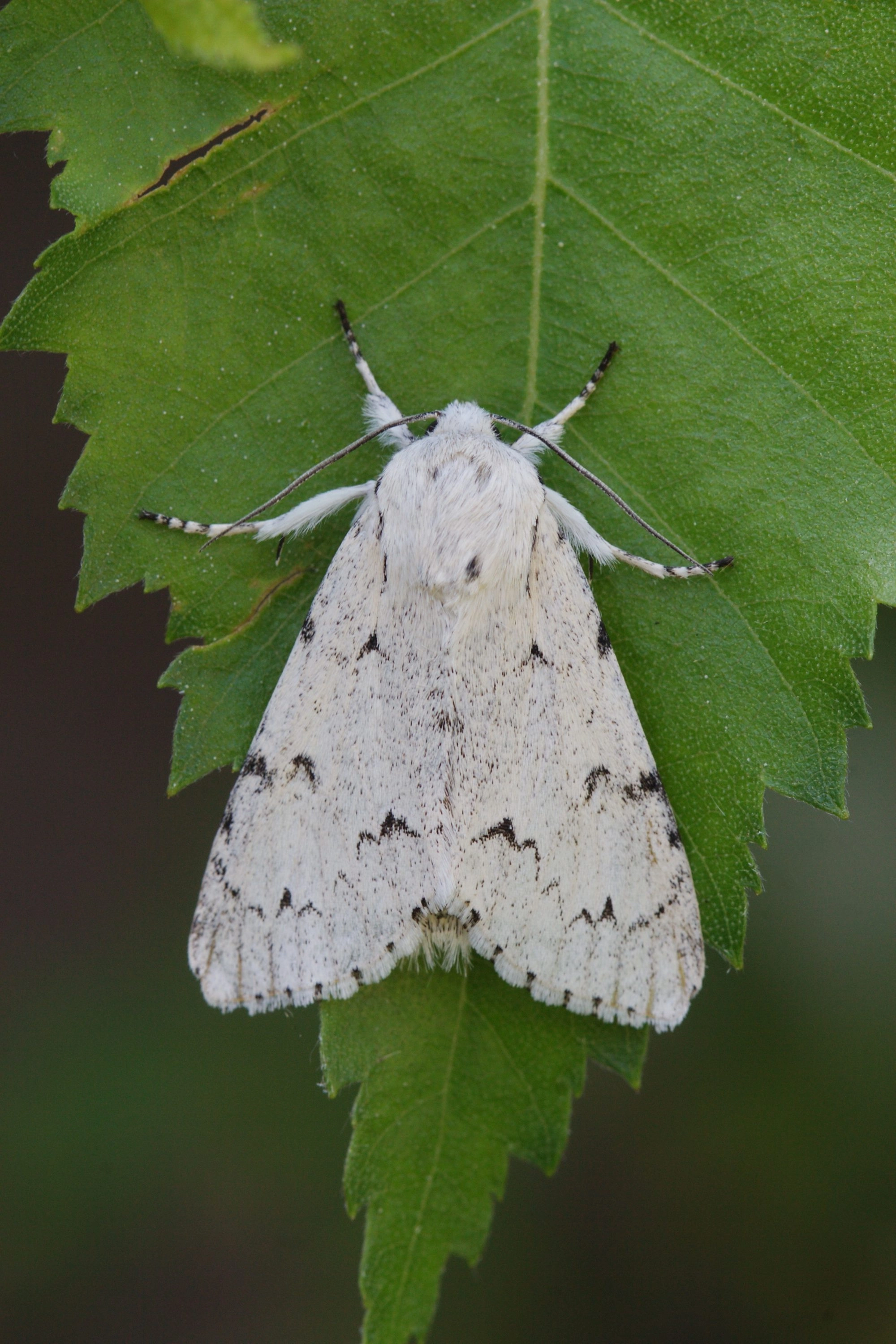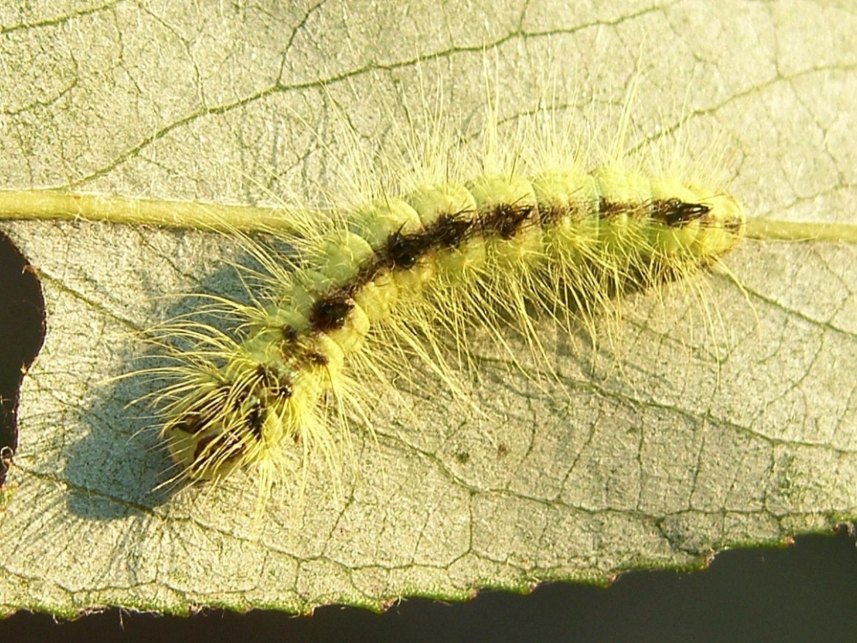 Tot 37 mm; lichaam bedekt met een dichte vacht van fijne golvende haren die bij de zuidelijke exemplaren witachtig en bij de noordelijke exemplaren geelachtig zijn; lichaam bleek groen. Vlak voor de verpopping wordt het lichaam donkerder en de beharing wordt zwart.