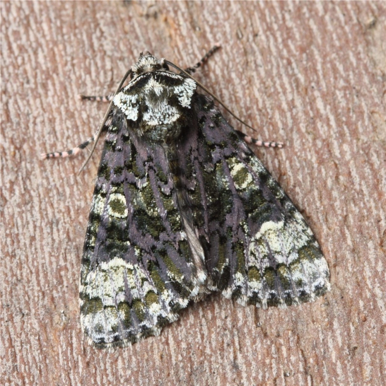 Voorvleugellengte: 17-19 mm. De voorvleugel van deze uil heeft een zwartachtige grondkleur met een subtiel patroon van purperachtig bruine en olijfgroene vlekken en dwarslijnen en een fijne witte marmering. Opvallend is de grote witachtige vlek in de vorm van een kroontje aan de buitenzijde van de niervlek. Bij sommige exemplaren is de hoeveelheid wit sterk gereduceerd, of zelfs helemaal afwezig, en is de vlek groen- of bruinachtig; de vorm van het kroontje blijft meestal wel zichtbaar. Op de bovenkant van het borststuk bevindt zich een lichte tekening. Deze tekening heeft vaak de vorm van een schedel; dit is echter niet altijd even duidelijk te zien.