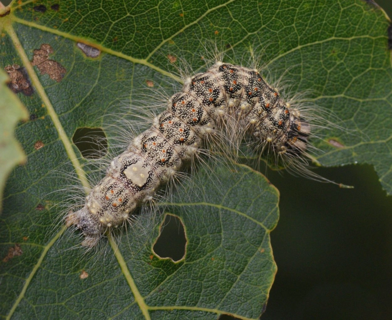 Tot 35 mm; lichaam spaarzaam bedekt met lange, fijne, lichtgrijze haren; kleur mat grijsachtig wit met donkerder grijze tekening; over de rug een rij zwarte vlekken met daarin roodachtige of oranje stippen; op de rug van segment tien een grote okerachtig witte vlek; poten bleek okerkleurig; kop groot, witachtig met donkergrijze tekening of donkergrijs met lichtere tekening.