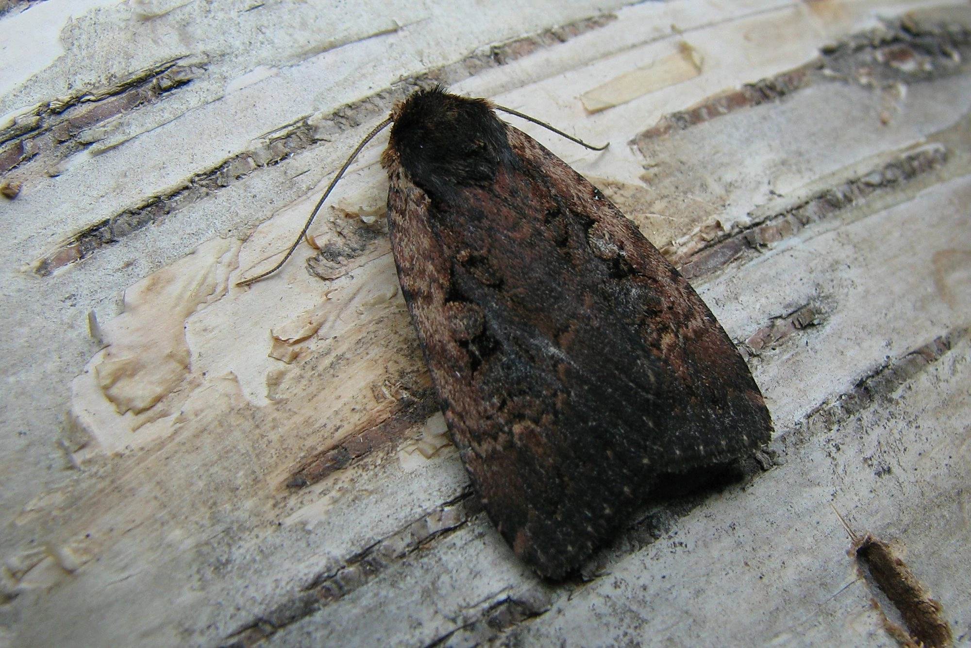 De splinterstreep (Naenia typica), de enige andere uil met zo'n brede voorvleugel, is veel bonter getekend.