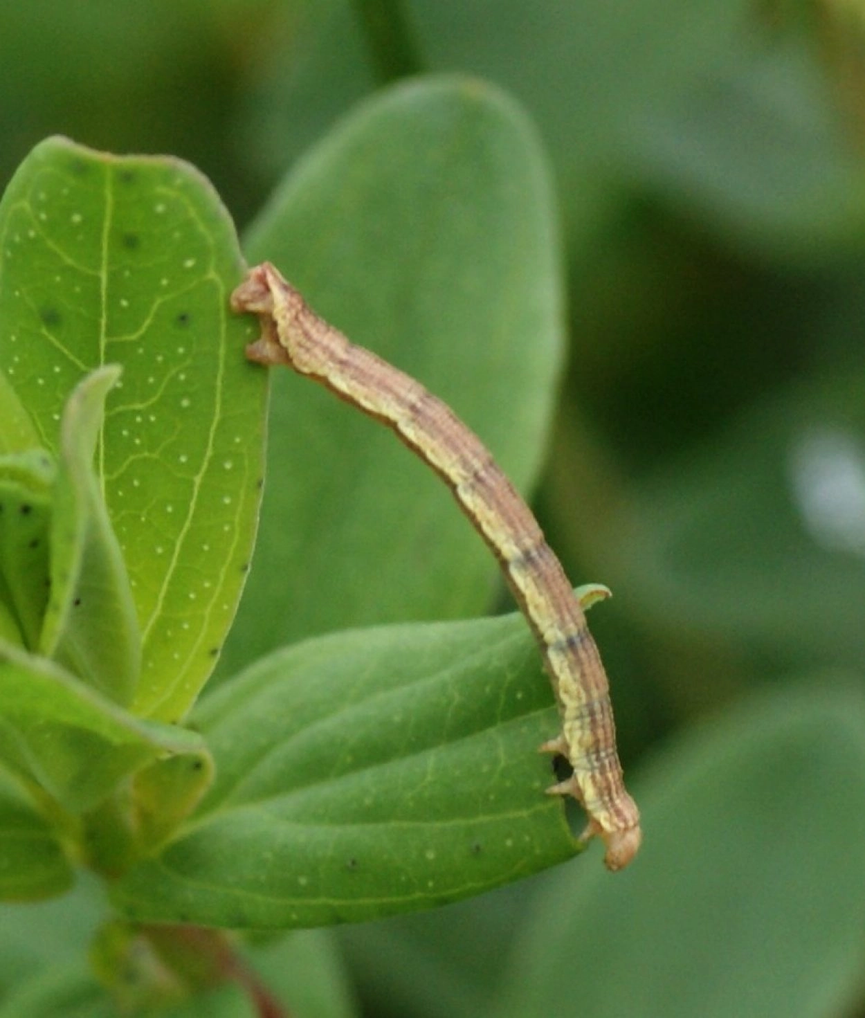 Streepblokspanner (Aplocera plagiata).N.B.: vergelijk behalve de uiterlijke kenmerken ook de tijd van het jaar waarin de rupsen voorkomen, het habitat en de waardplant(en).
