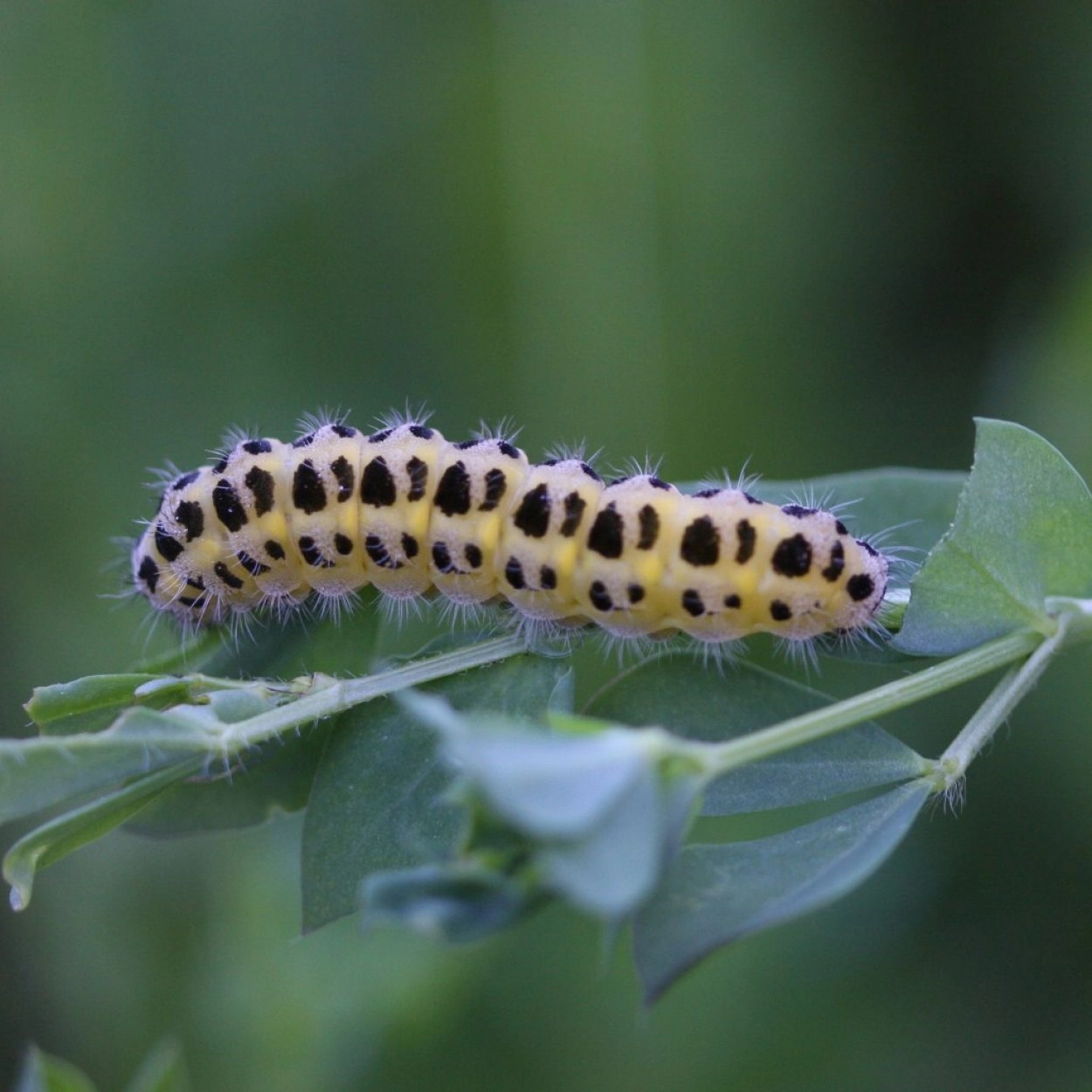 Tot 22 mm; plomp en gedrongen lichaam met abrupt afgeknotte uiteinden; groenachtig geel met een dubbele rij zwarte vlekken op de rug, aan weerszijden van deze zwarte vlekken een rij gele vlekjes; aan weerszijden van het lichaam ook een rij zwarte vlekjes, die bij bleke exemplaren kunnen ontbreken; bij sommige vormen zijn de zwarte vlekken dusdanig vergroot, dat de rupsen praktisch geheel zwart zijn; in het lichaam ingetrokken kop.