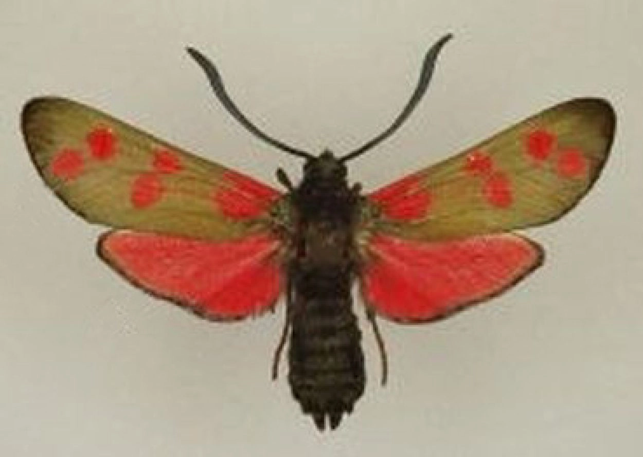 Vijfvlek-sint-jansvlinder (Zygaena trifolii).N.B.: vergelijk behalve de uiterlijke kenmerken ook de tijd van het jaar waarin de rupsen voorkomen, het habitat en de waardplant(en).