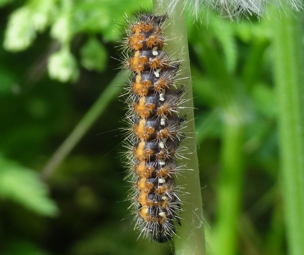 Tot 50 mm; lichaam donker bruin, bekleed met korte, geelachtig bruine of grijsachtige haarborstels, die op oranjebruine wratten staan ingeplant; over de rug een brede, gebroken oranjegele middenband en op de flanken een gebroken geelachtig witte lengtestreep; kop glimmend zwart.