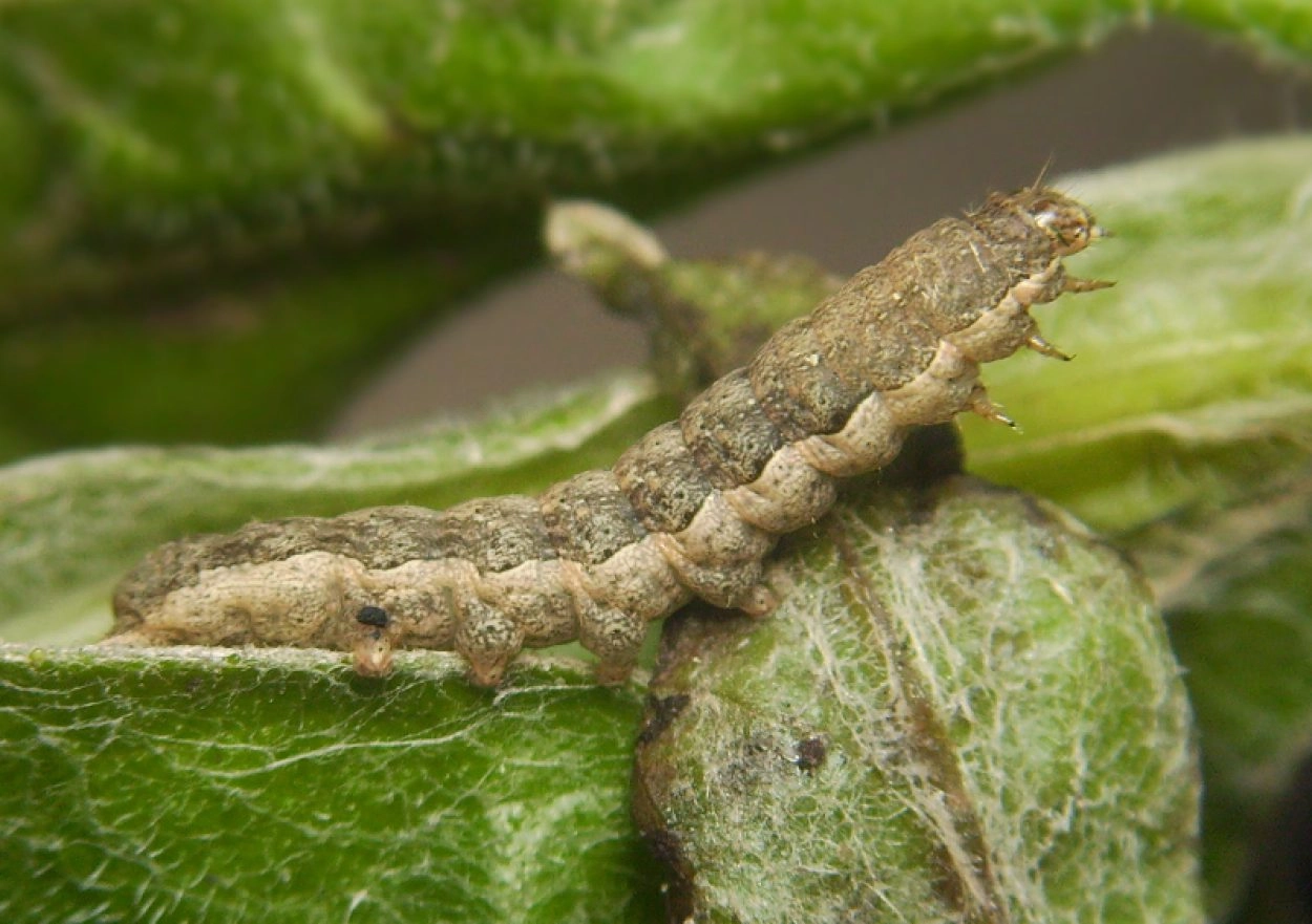 Tot 48 mm; lichaam grijsachtig bruin met onder de lijn van de spiracula een brede, golvende, grijsachtig witte lengteband; over de rug een rij witachtige, V-vormige vlekken; kop grijsachtig wit met donkerbruine tekening.