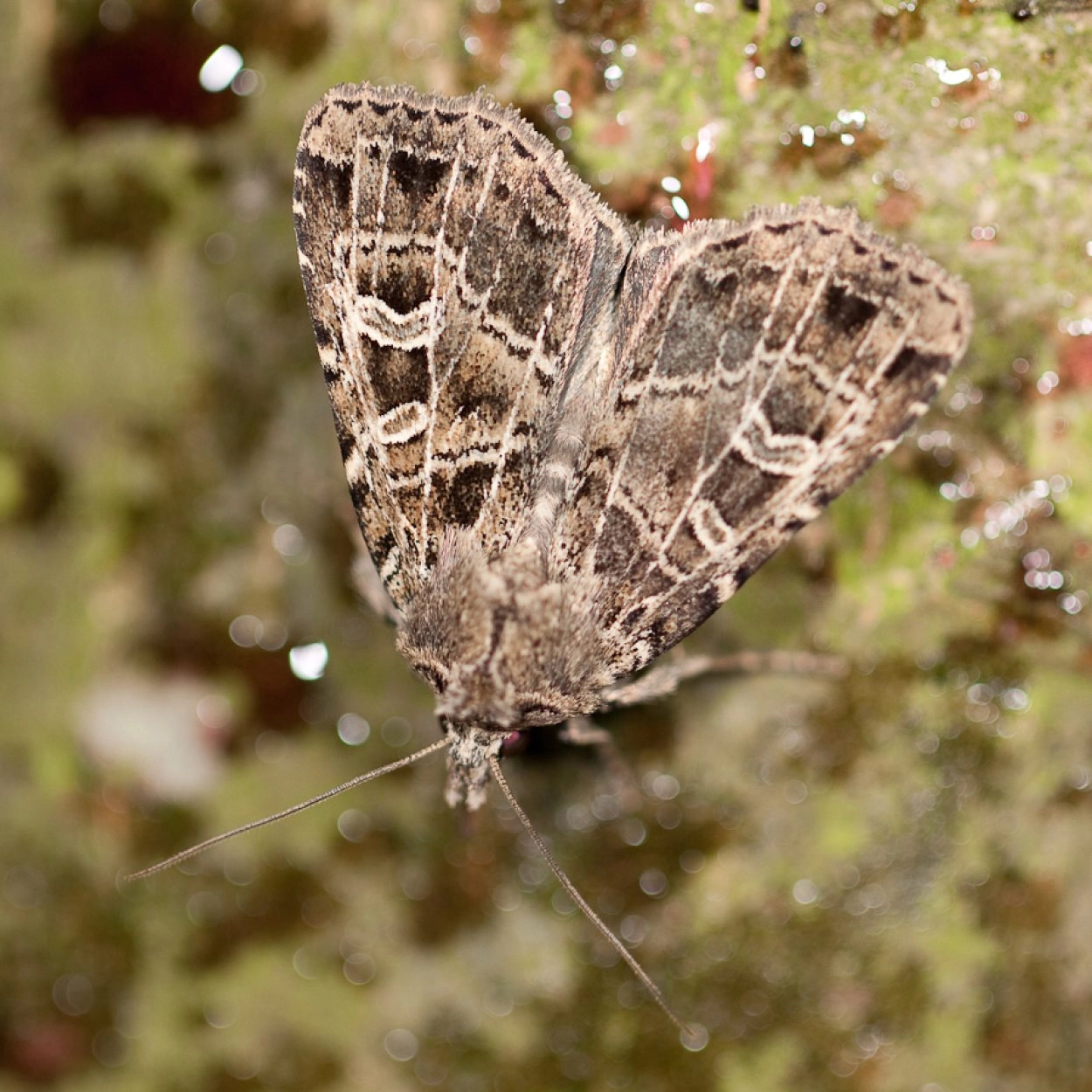 Voorvleugellengte: 17-22 mm. Een grijsachtig bruine uil met een opvallend brede voorvleugel. De tekening bestaat uit een karakteristiek netwerk van witachtige aders en dwarslijnen; ook de contouren van de ringvlek en de niervlek zijn witachtig. De achtervleugel is bruinachtig grijs.