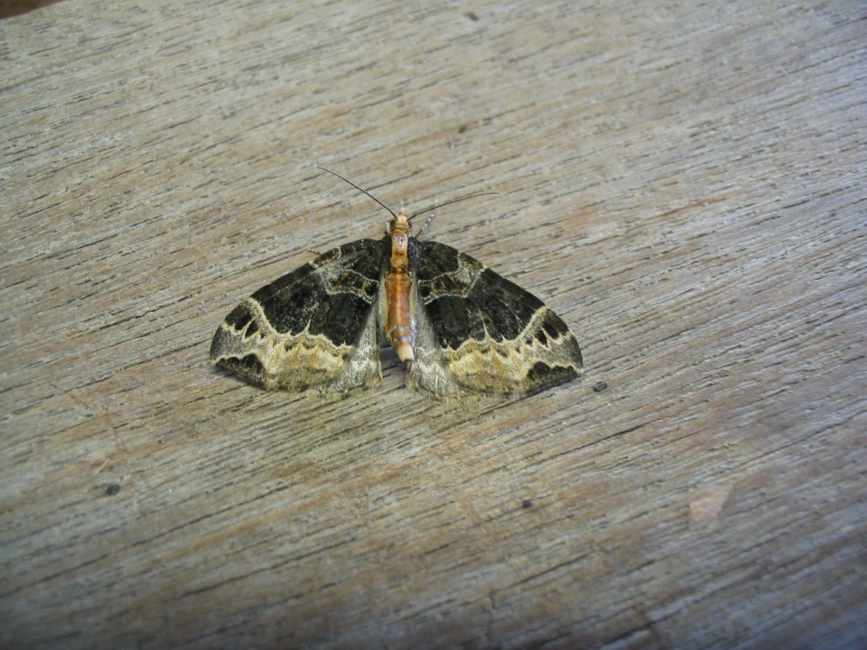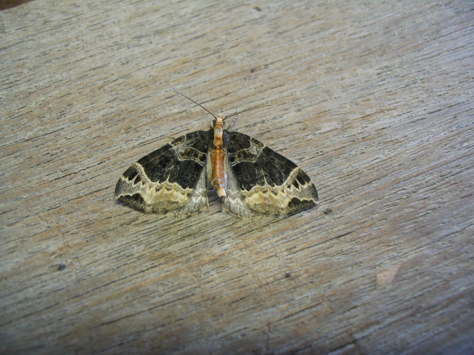Marmerspanner (Ecliptopera silaceata).N.B.: vergelijk behalve de uiterlijke kenmerken ook de tijd van het jaar waarin de rupsen voorkomen, het habitat en de waardplant(en).