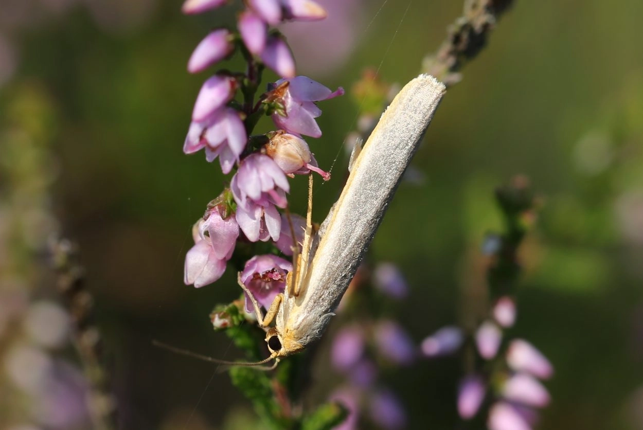 Glad beertje (Eilema griseola) en klein kokerbeertje (Eilema pygmaeola). N.B.: vergelijk behalve de uiterlijke kenmerken ook de tijd van het jaar waarin de rupsen voorkomen, het habitat en de waardplant(en).