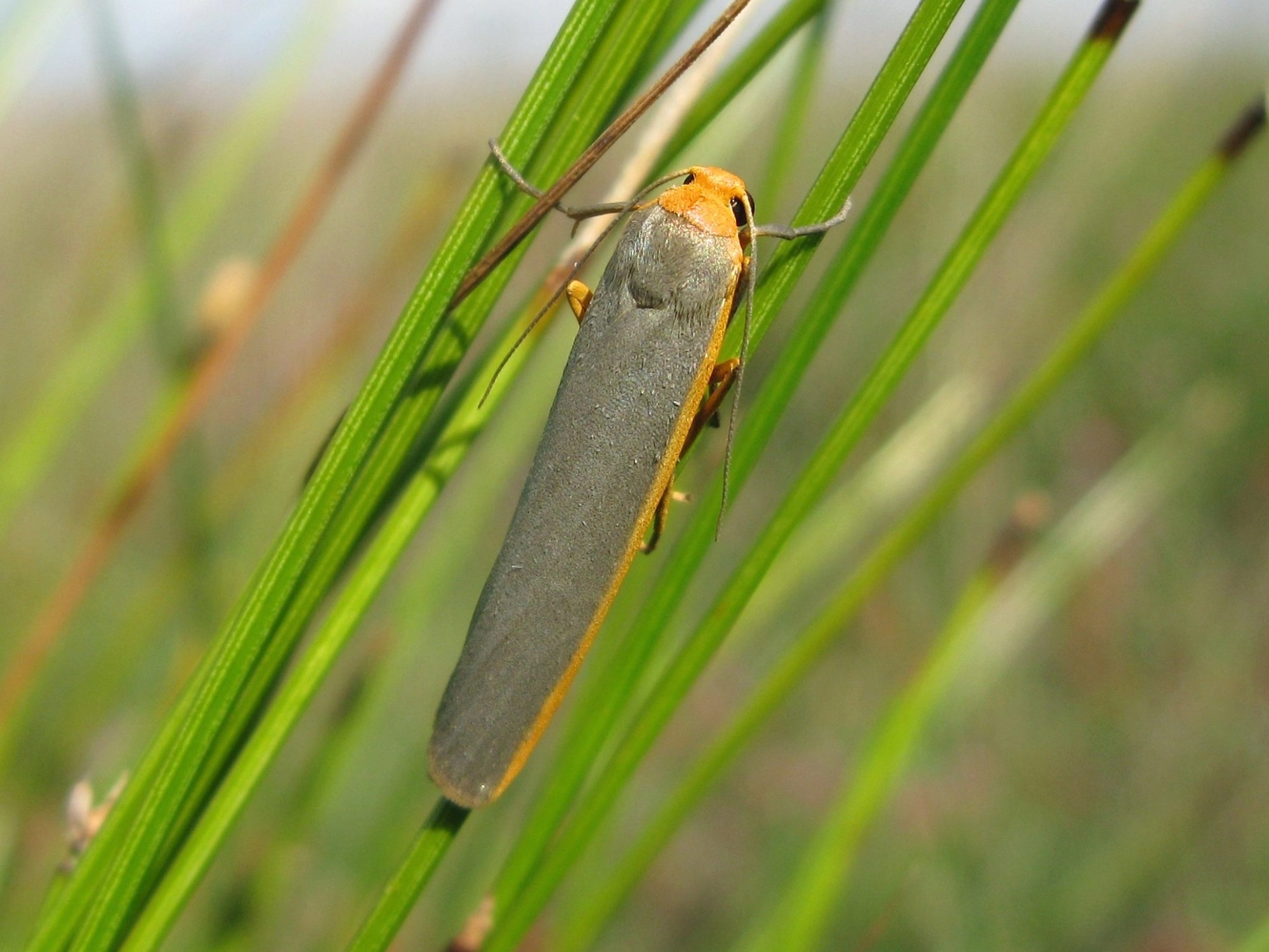 Voorvleugellengte: 14-18 mm. De scherp afgetekende, oranjegele streep langs de voorrand van de grijze voorvleugel is over de hele lengte van de vleugel even breed en wordt niet smaller in de richting van de vleugelpunt. De achtervleugel is lichtgeel en heeft soms een grijze veeg langs de voorrand. Een opvallend kenmerk is de geheel oranjegele kraag. De vlinder rust met de vleugels in een kokertje om het lichaam gevouwen.