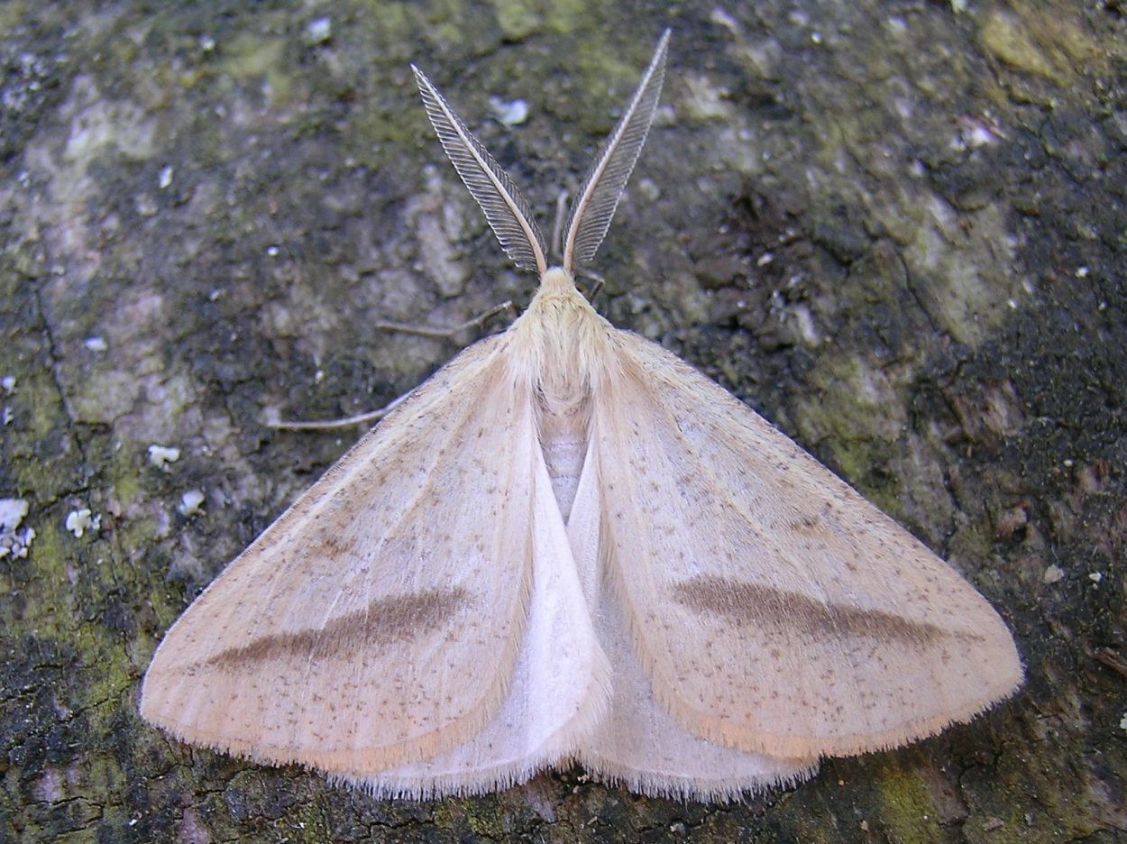 Voorvleugellengte: 15-18 mm. Over de lichtgele voorvleugel loopt een (rood)bruine schuine streep vanuit de vleugelpunt naar de binnenrand. Op de onderzijde van de achtervleugel bevindt zich een grijze lijn en een middenvlek. Het mannetje heeft geveerde antennen. Het vrouwtje is meer gespikkeld dan het mannetje en heeft ongeveerde antennen.