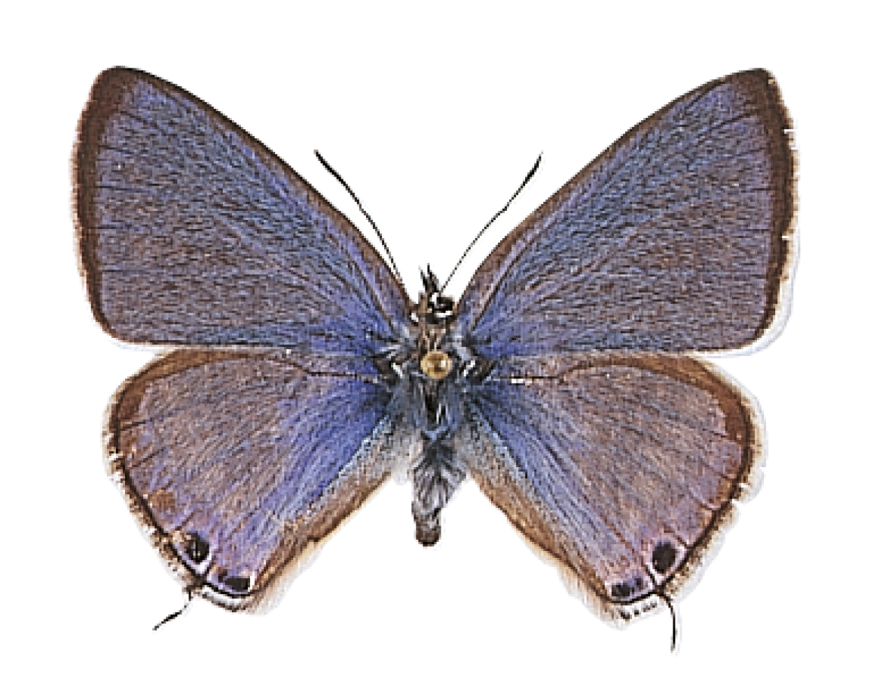 Voorvleugellengte: circa 15 mm. De bovenkant van de vleugels is bij het mannetje violetblauw en bij het vrouwtje bruin met blauwviolette middencel. De grondkleur van de onderkant van de vleugels is lichtbruin met smalle witte dwarsstrepen en twee oogvlekken in de binnenrandhoek. Deze oogvlekken zijn zowel op de boven- als op de onderkant van de vleugel goed zichtbaar. Verse exemplaren hebben opvallend lange staartjes aan de achtervleugel, ter hoogte van de grootste oogvlek.