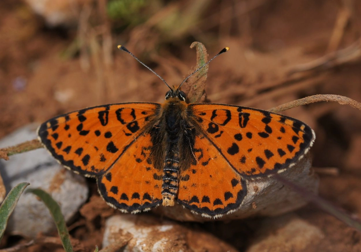 Voorvleugellengte: 18-24 mm. De zwarte tekening op de bovenkant van de vleugels is gereduceerd tot vrij van elkaar staande vlekjes. De roodbruine grondkleur is bij het mannetje op voor- en achtervleugel gelijk, het vrouwtje heeft op de voorvleugel een afwijkende, grijsbruine grondkleur en een duidelijker ontwikkelde zwarte tekening. De onderkant van de achtervleugel is crèmekleurig met oranje banden en zwarte strepen en vlekken.
