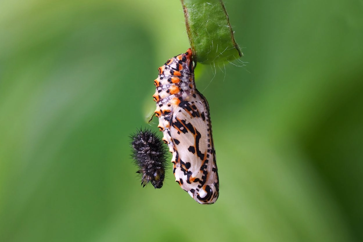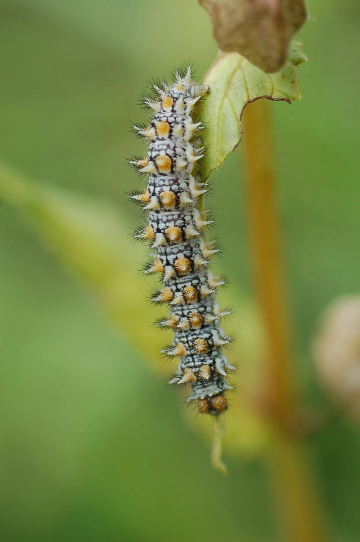 Tot 28 mm; lichaam witachtig met zwarte strepen en twee rijen grote, roodachtig oranje vlekken langs de rug, waarbij in elke vlek een doorn staat ingeplant; de overige doorns zijn witachtig met fijne zwarte haartjes; kop roodachtig bruin.