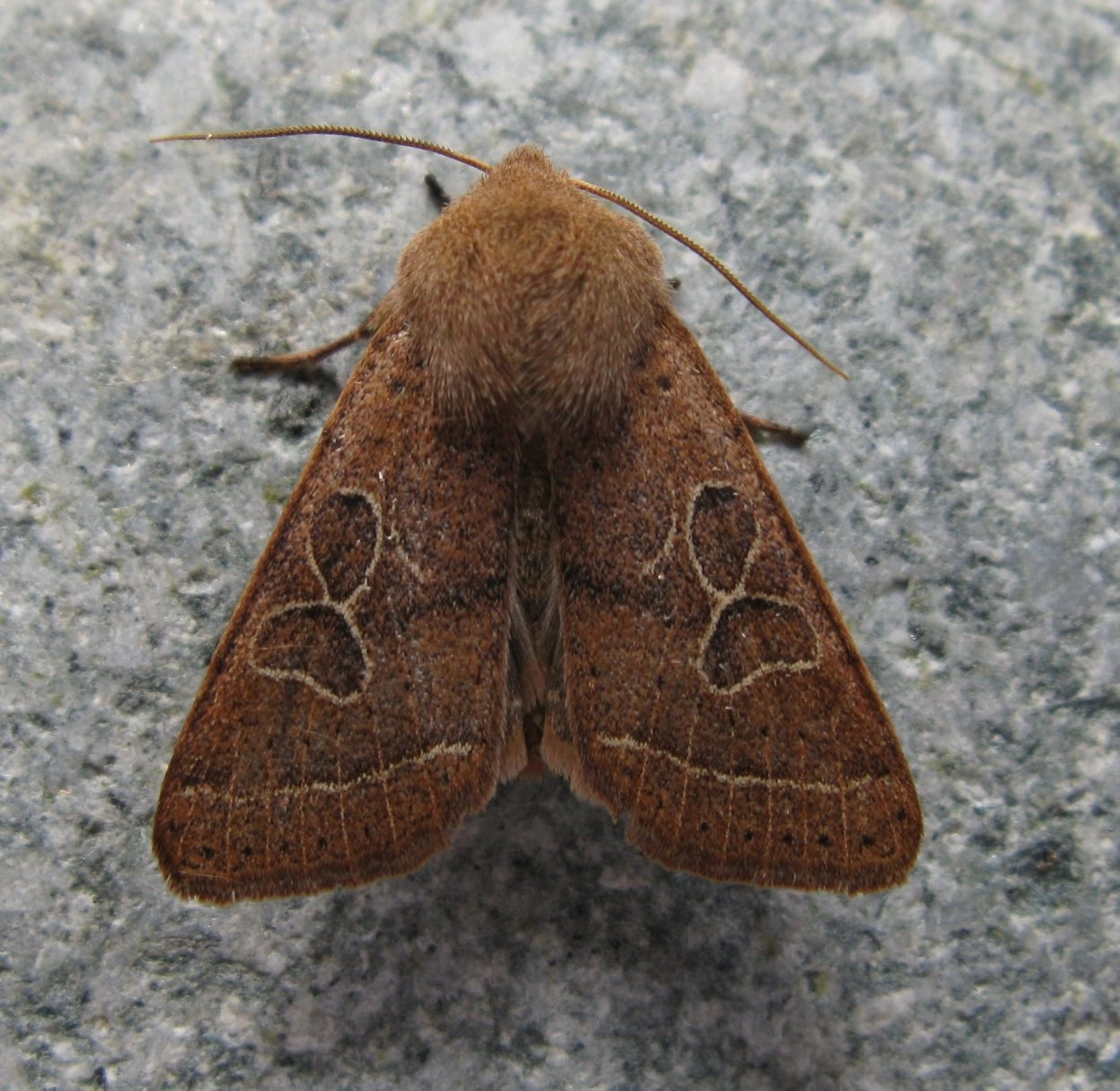 Voorvleugellengte: 13-17 mm. Deze Orthosia-soort is te herkennen aan de afgeronde voorvleugelpunt, de opvallende licht omlijnde, grote ringvlek en brede niervlek en de gelijkmatig grijze achtervleugel. Ook de lichte, aan de binnenzijde iets donker afgezette golflijn op de voorvleugel valt op. De zeer variabele bruine grondkleur loopt uiteen van licht zandkleurig bruin via warmbruin en oranjeachtig of grijsachtig bruin tot zwartachtig bruin. Soms is een lichte tapvlek aanwezig.