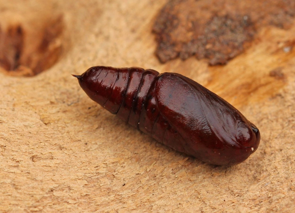 Tot 40 mm; plomp; lichaam groen met geelachtig witte spikkels en geelachtige ringen tussen de segmenten; over de rug een geelachtig witte middenstreep en een kleine identieke lengtestreep over de spiracula; achter de kop en op de rugzijde van het elfde segment opvallende gele dwarsbanden; kop licht bruinachtig groen.