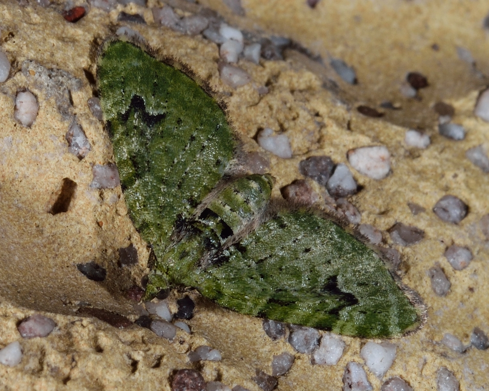 Voorvleugellengte: 8-11 mm. De duidelijke zwarte V in de buitenste dwarsband op de verder vrij zwak getekende, tamelijk ronde voorvleugel is kenmerkend. Verse vlinders hebben een groene kleur, die in de loop van de vliegtijd echter kan vervagen tot licht geelbruin. De achtervleugel is grijsachtig wit. Het achterlijf is groen met twee parallelle rijen zwarte stippen en een zwarte band. In rusthouding zijn de vleugels minder ver uitgespreid dan bij verwante soorten en worden ze soms omhoog geklapt.